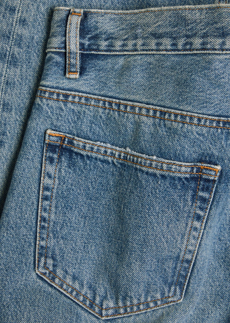 • Mid-rise fit, straight-leg cut, belt loops, five pockets, slightly distressed trims, whiskered and washed finish