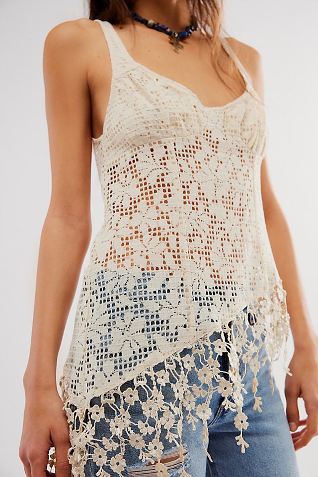 So femme and floral-adorned, this unique top is featured in a sleeveless silhouette and lace-inspired fabrication with a low, scoopback and dangling floral detailing.