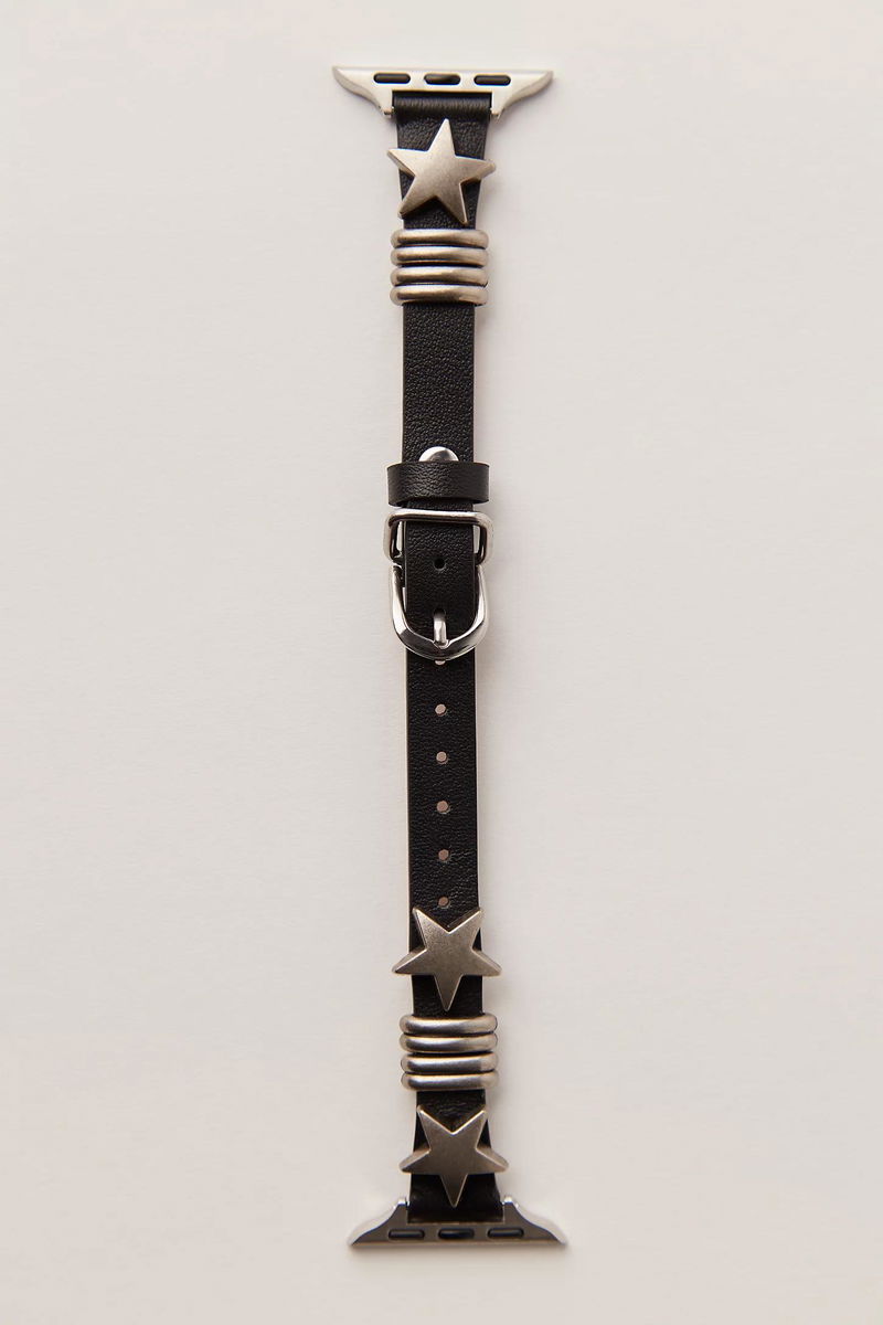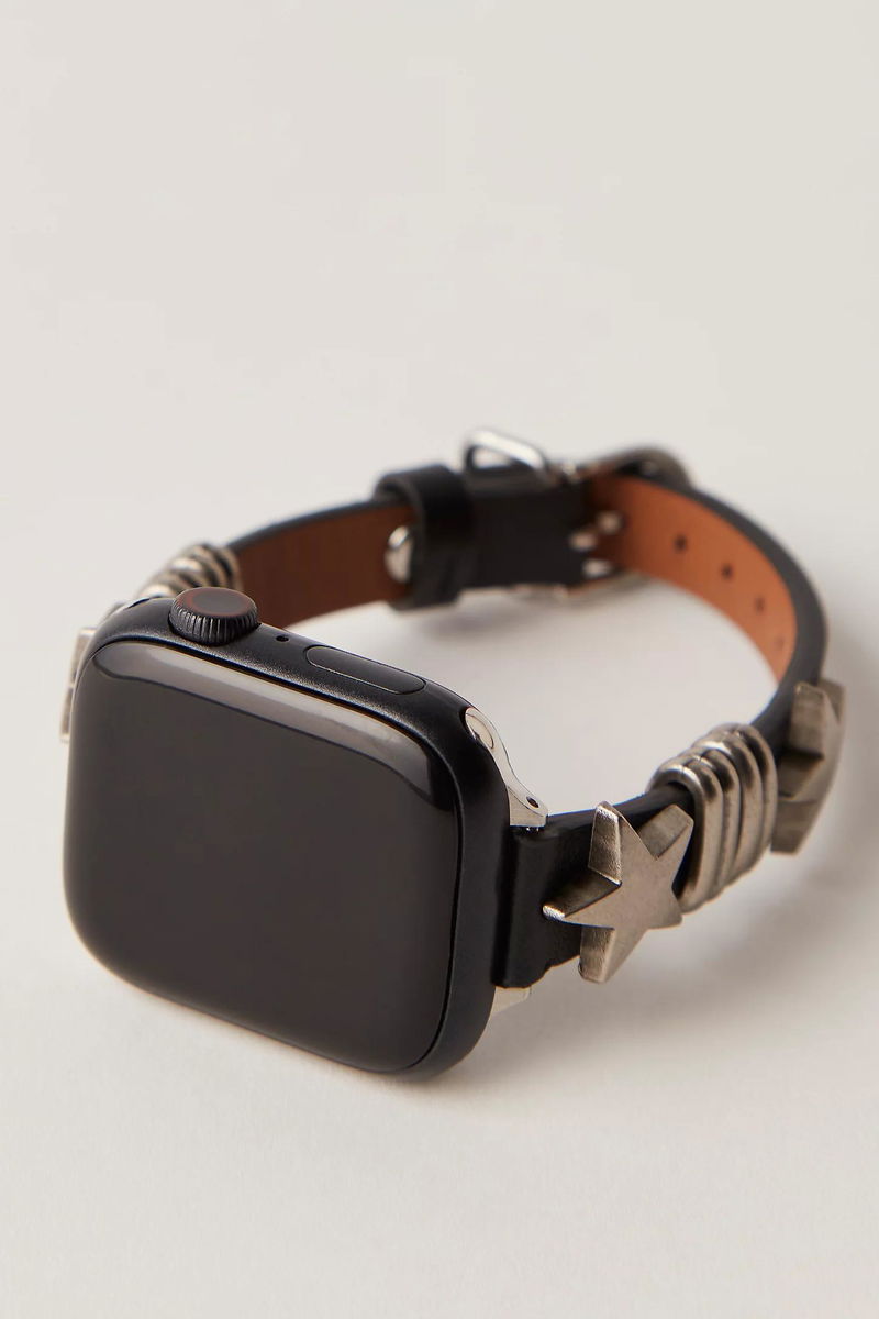 Make a statement with this leather Apple Watch band featuring sleek silver star-inspired hardware and a bold design on a luxe leather strap.