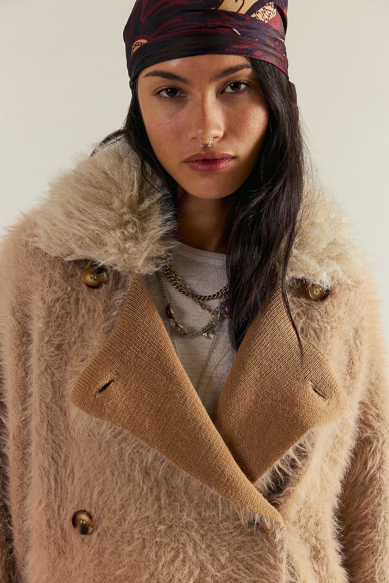 Elevate your jacket collection with this edgy layer, featuring a bold brushed faux fur fabrication, a contrasting collared neckline, and a classic double-breasted design for a timeless touch.