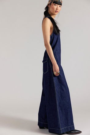 One and done–slip into this jumpsuit from free-est, featured in a cropped silhouette and a textured fabrication with a defined drawcord waist and classic shirting bodice.