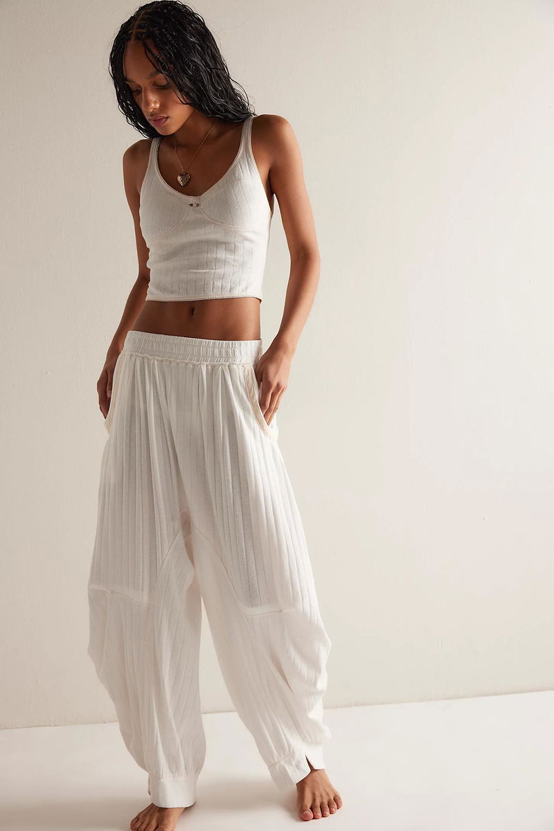 Endlessly comfy in the softest pointelle cotton fabrication, these lounge pants from Intimately feature a wide-leg, balloon silhouette, seam details, and a cool dropped crotch design for a relaxation-ready pair.
