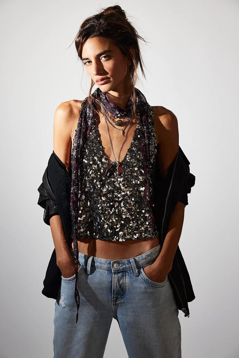 Dazzle day or night with this sparkly vest, featuring a classic, cropped silhouette, a stunning all-over embellished fabrication, and an elongated V-neckline, making it the perfect layering piece.