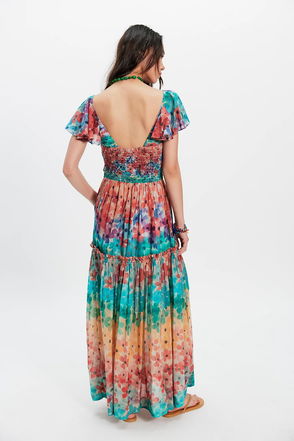 Printed to perfection in a forever flattering, flowy design, this stunning maxi dress features a defined sweetheart neckline with halter shoulder straps, attached contrasting bodysuit underneath, and low back detail for an added special touch.