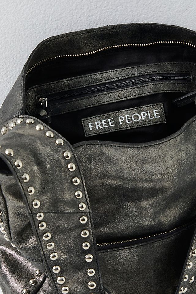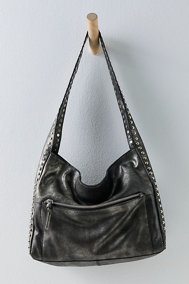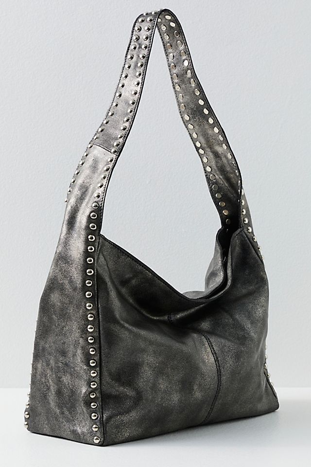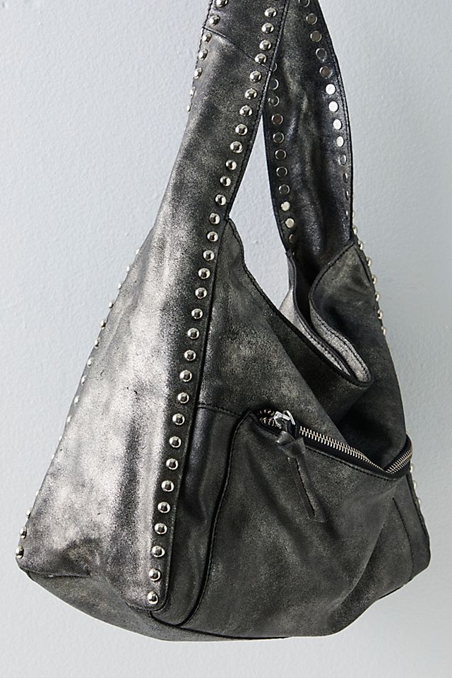 Go edgy with this metallic, studded-out shoulder bag, equipped with endless pockets for effortless carrying. Shoulder style, leather fabrication, metallic finish, single strap, studded accents, exterior zipper pocket, interior zipper pocket, zipper closure. This bag gives the perfect rockstar finish to your look.