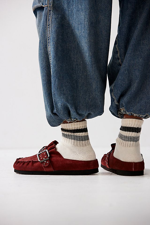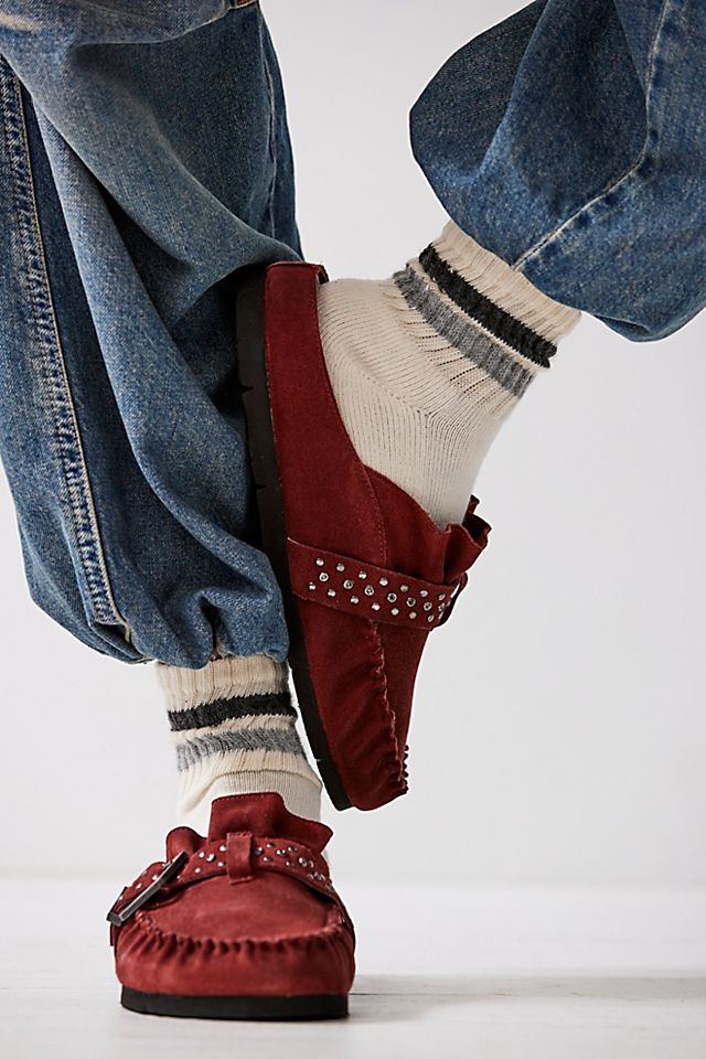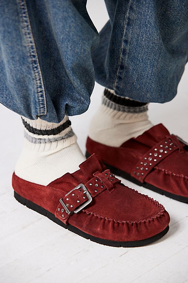 So effortless for a laid back look, these easy mules feature a soft suede uppers with a moccasin-inspired construction, covered in studs for an edgy look.