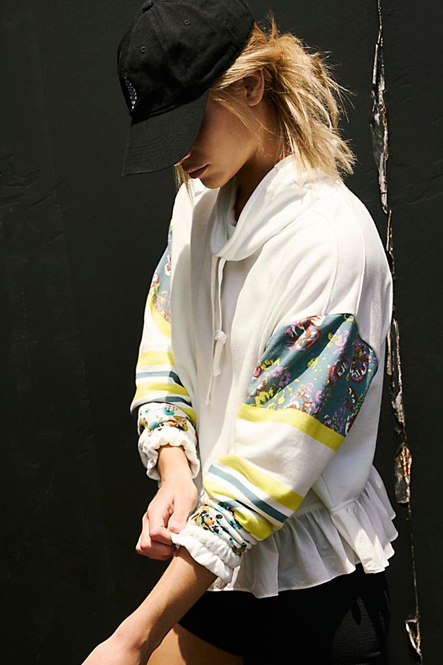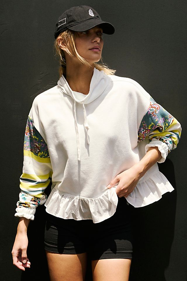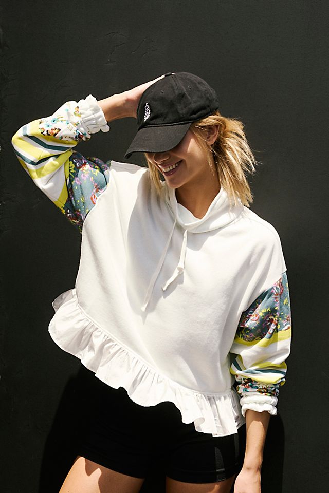 So perfect for pre- or post-workout, this soft pullover is featured in a relaxed fit and hip-length style with a high-neckline and feminine ruffled trim. Slouchy, relaxed fit; pull-on style. Soft fabrication, long-sleeves with printed detailing and cinched cuffs, high-neckline with adjustable drawstrings, ruffled hemline. This print-adorned pullover is an elevated addition to your post-workout layers.
