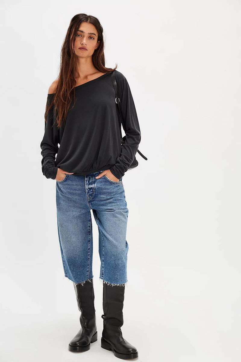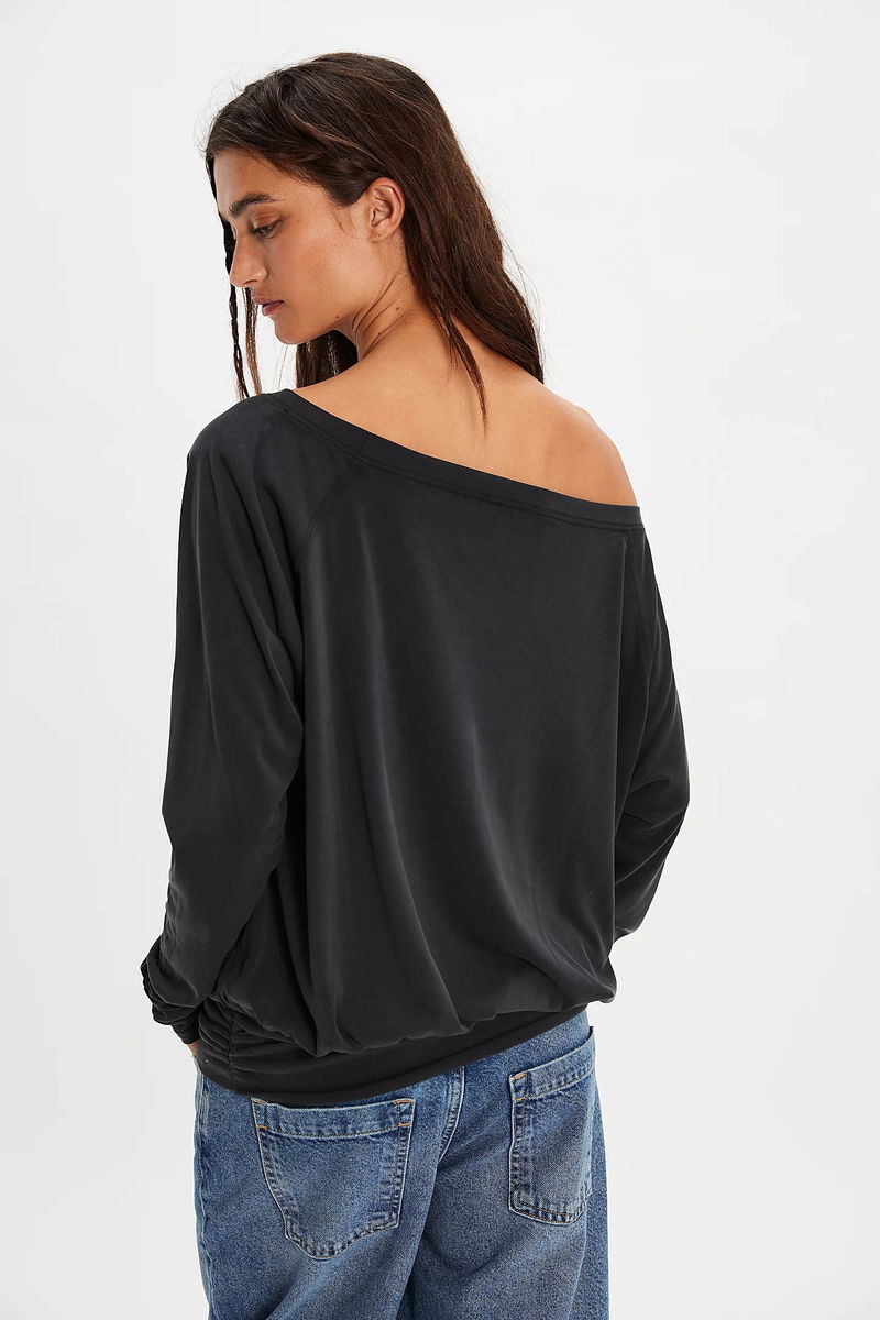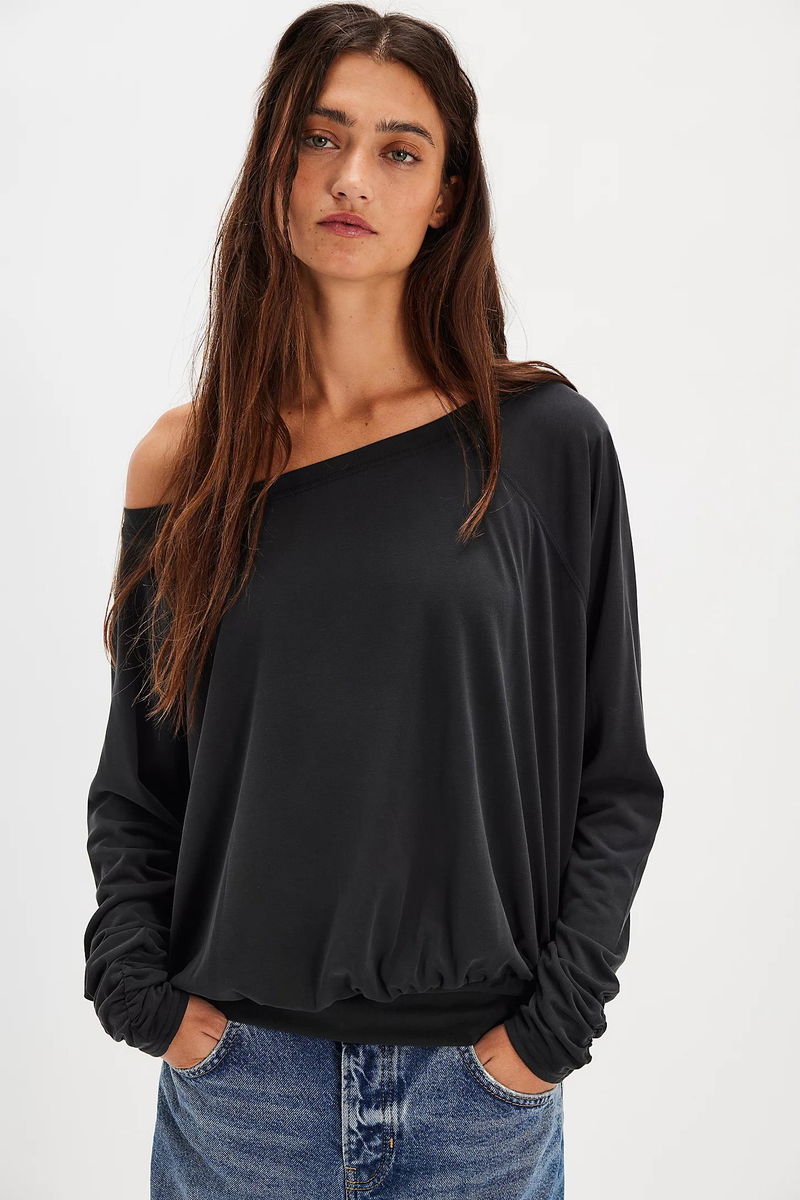 Easy, effortless, and essential, this versatile long-sleeve top features an exaggerated boat neckline, a soft, airy fabrication, and a relaxed, versatile silhouette that can be worn longer on the body for a longline design.