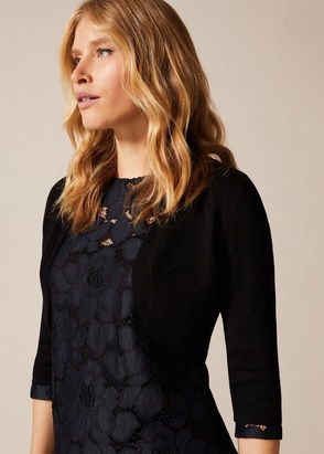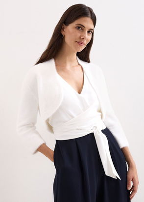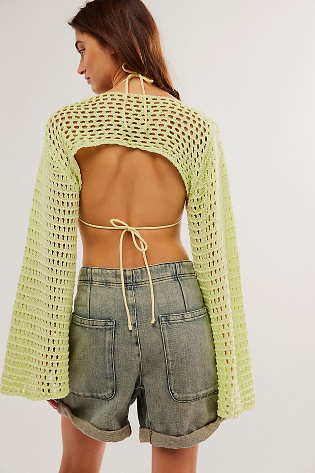 Give any look and breezy layer with this extra-cropped crochet bolero. Relaxed, extra cropped. Pull-over style, crew neckline, bell sleeve, crochet fabrication. Pair over a tank or fitted tee for a beachy touch.