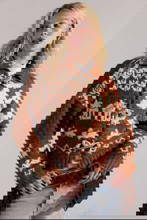 Perfectly printed, this graphic cardi is featured in a delicate, crepey sheer knit with buttons fown the front for a dainty finish.