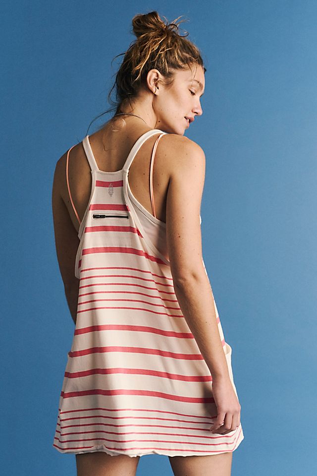 An vibrant printed addition to the Hot Shot collection, this soft dress features a lightweight fabrication and mini-length silhouette with oversized patch pockets. Soft fabrication; lightweight design; scoop neckline, think shoulder straps; racerback detail; zippered back pocket; oversized patch pockets at front.