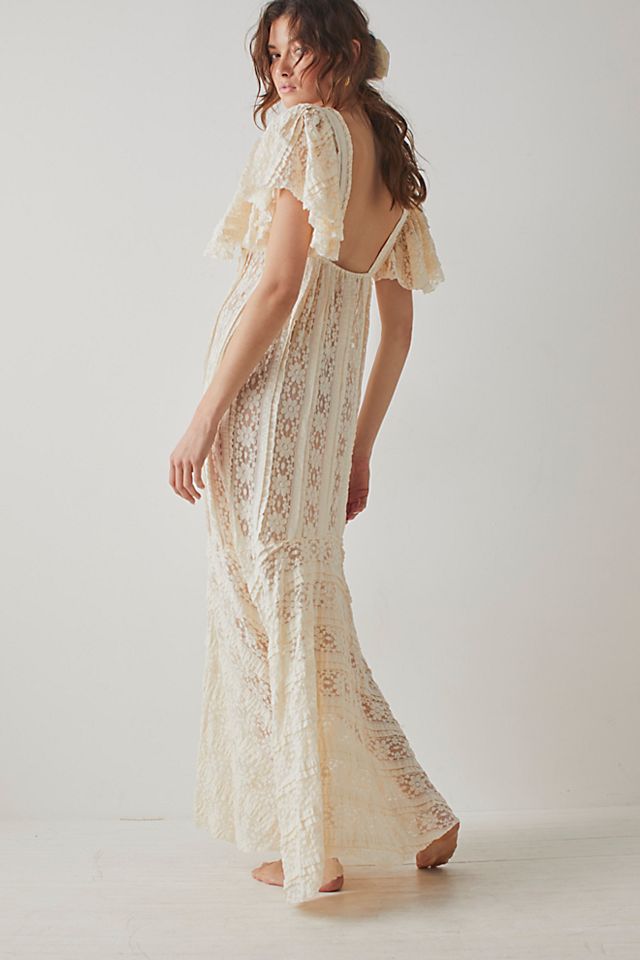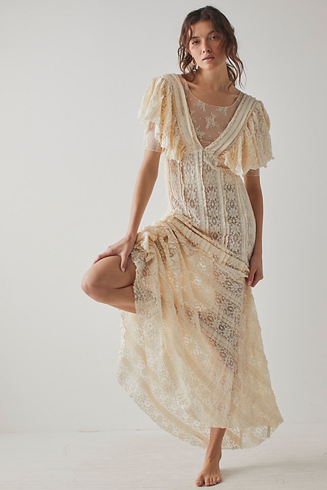 So lovely in lace, this billowy slip is featured in a maxi-length and shapeless silhouette with a deep V-neckline and flutter sleeves. This feminine slip can be layered up or worn on its own with your favorite heels.