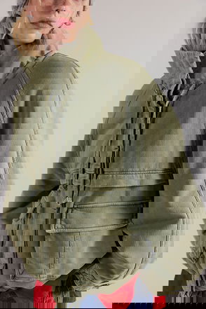 Utility-inspired with our signature twist, this flattering jacket is featured in a slim silhouette and textured cotton fabrication with a banded collar, buttons down the front, and a flared hem for a touch of femme.
