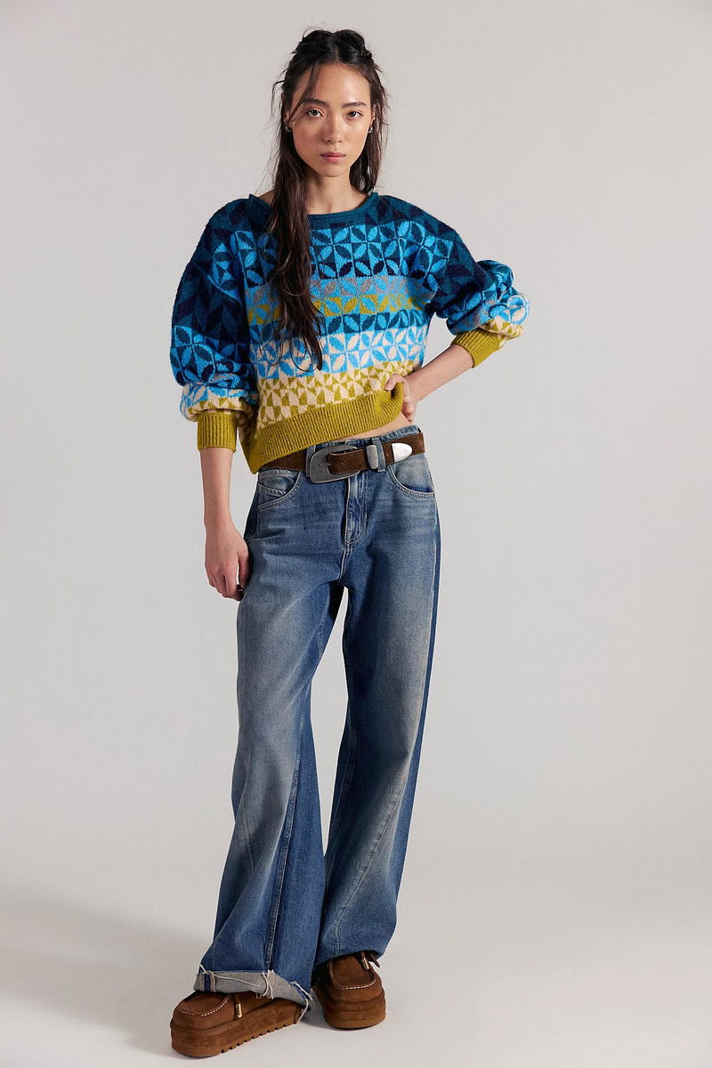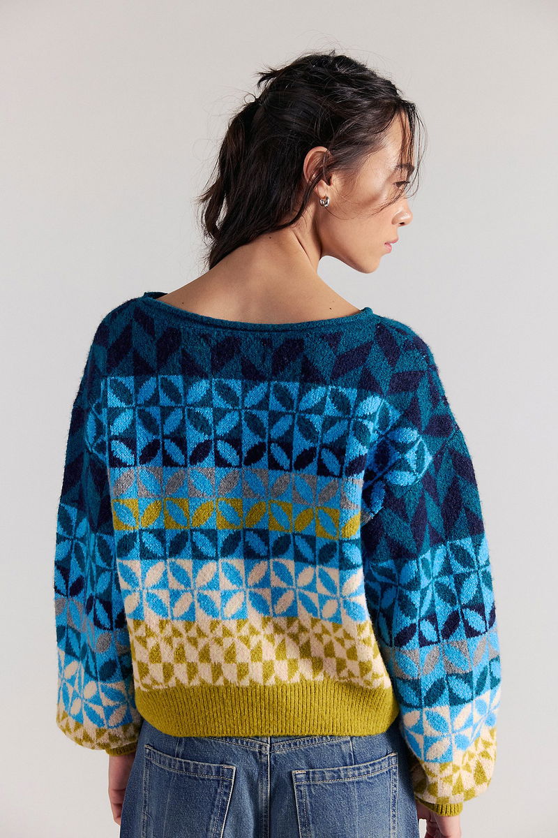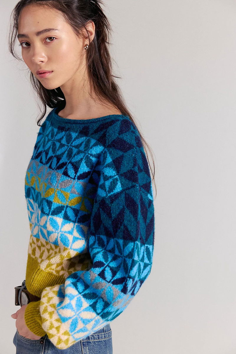 Grab your new favorite cozy essential; this playful pullover features a wide boat neckline, a cropped, boxy silhouette, and a soft knit fabrication.