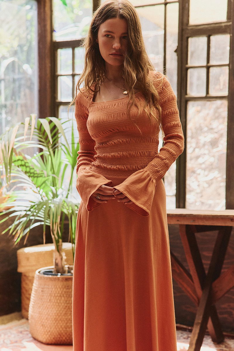 So flattering in every way, this long-sleeve midi dress from free-est features a square neckline and smocked upper for the perfect textural touch.