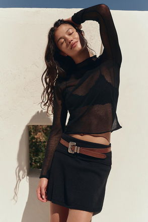 So femme and full of texture, this sweet top is featured in a slim-fitting silhouette and slightly cropped length with a deep V-neckline and sheer lace detail. Slim fit, slightly cropped. Textured fabrication, deep V-neckline, button-front closures, lace trim, scalloped edges, fitted sleeves with ruffled trim. This lace-adorned top is both femme and fun.
