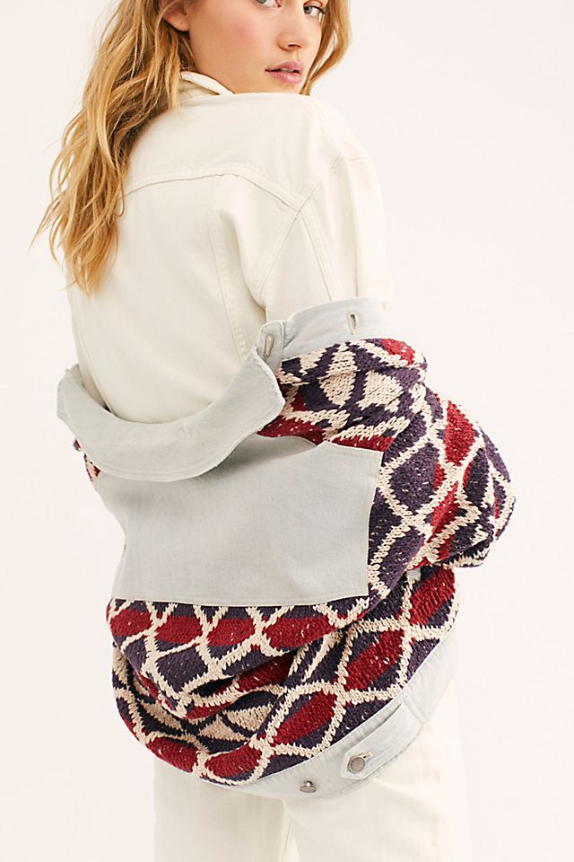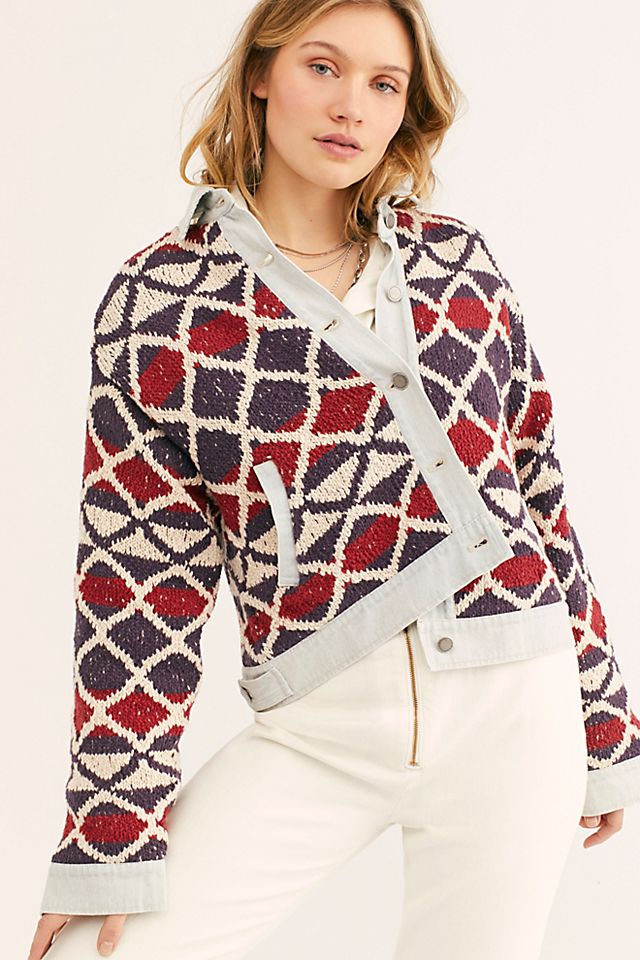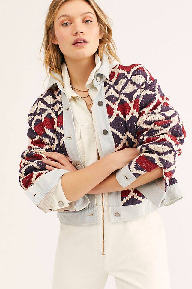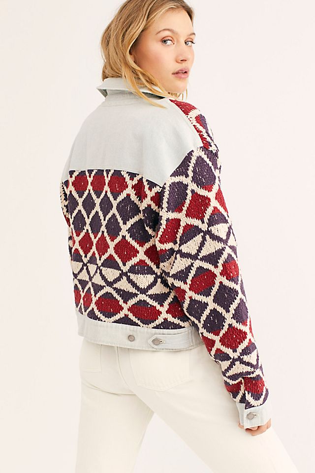 Western-inspired denim jacket pieced with printed cosy jumper trim.