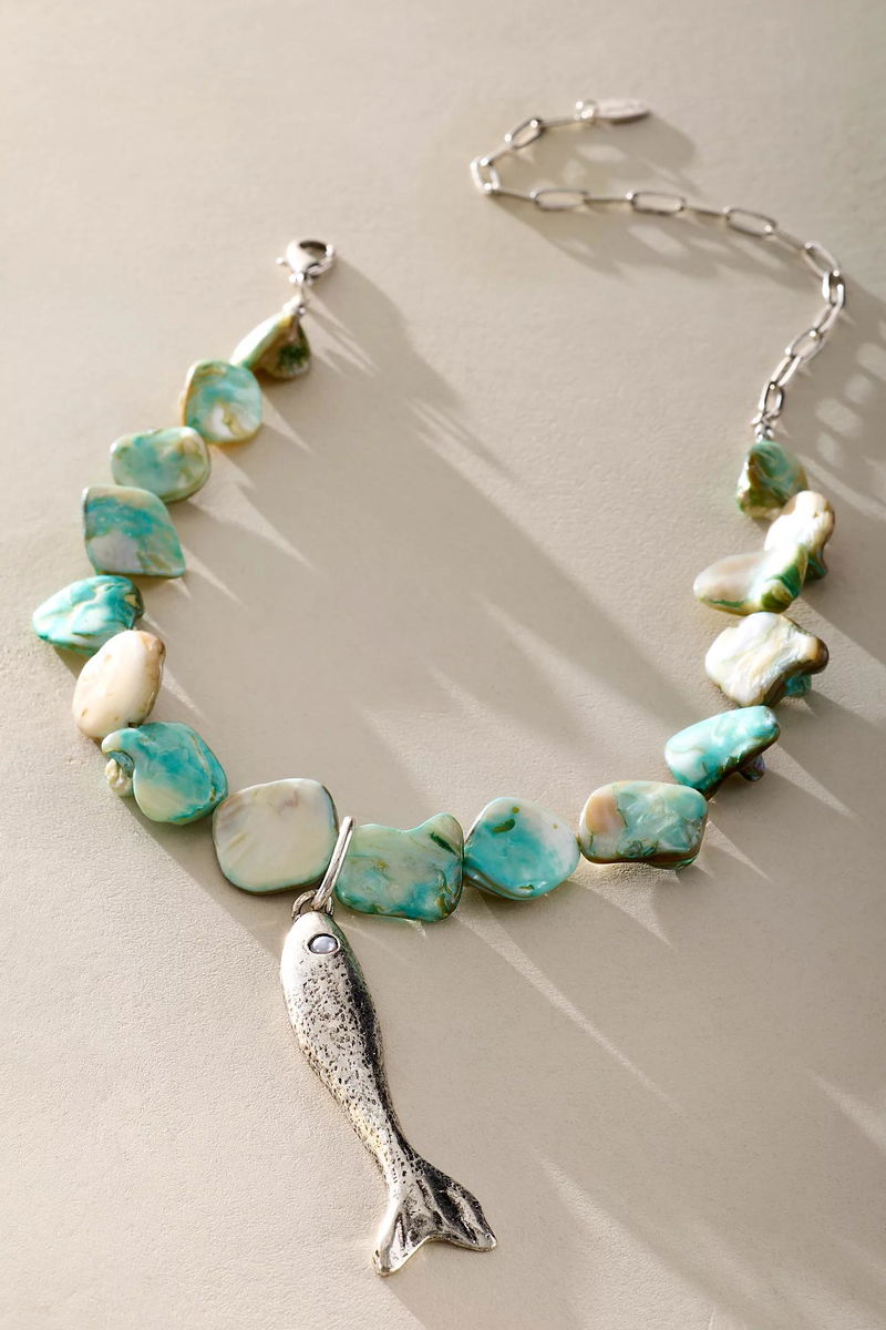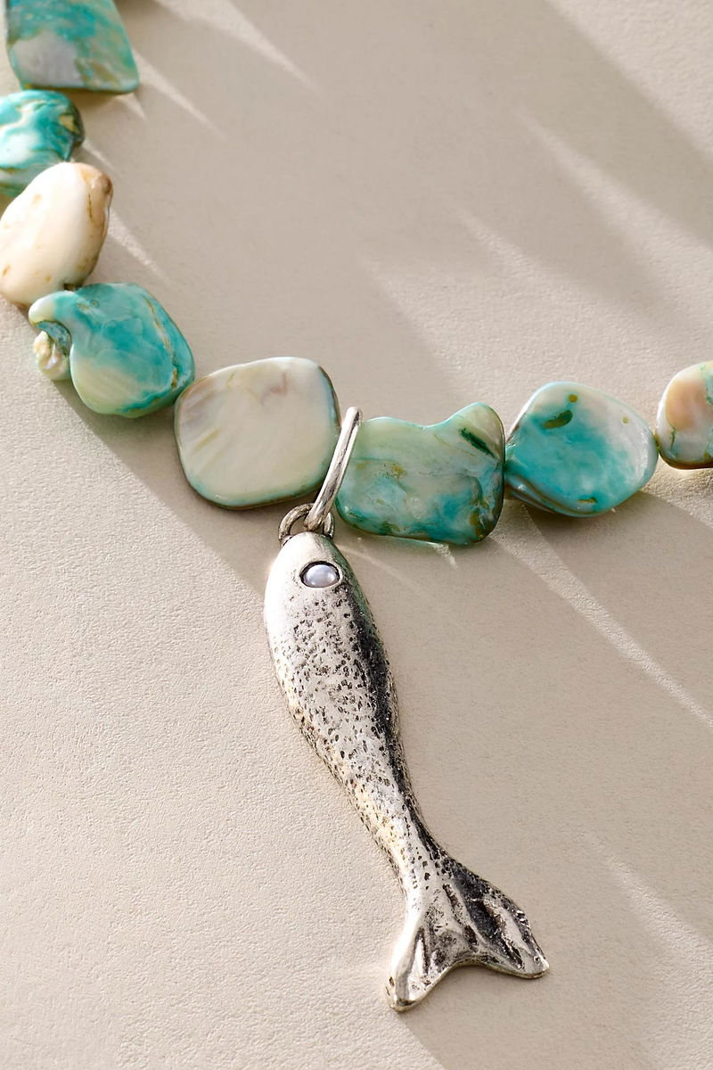 The perfect stand-out staple to level up your necklace rotation, this stunning style is featured in a chunky, stone-adorned design with fish pendant at center for the coolest finishing touch.