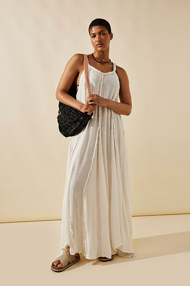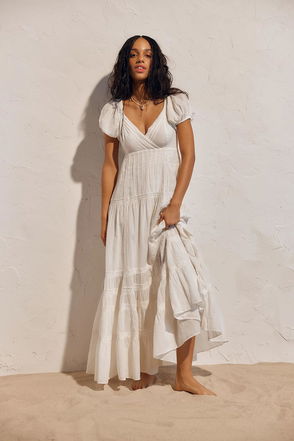 Forever ethereal and just as stunning, this must-have maxi from our free-est collection will turn heads with every wear. Billowy, shapeless silhouette. Ruffle trimming throughout, scoop neckline, dropped armholes, textured fabrication. So chic with endless ways to wear, throw this over your bikini or layer with a cozy cardi for a versatile transeasonal look.