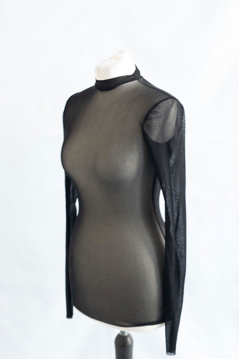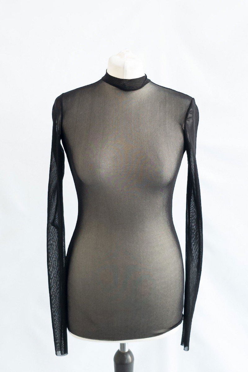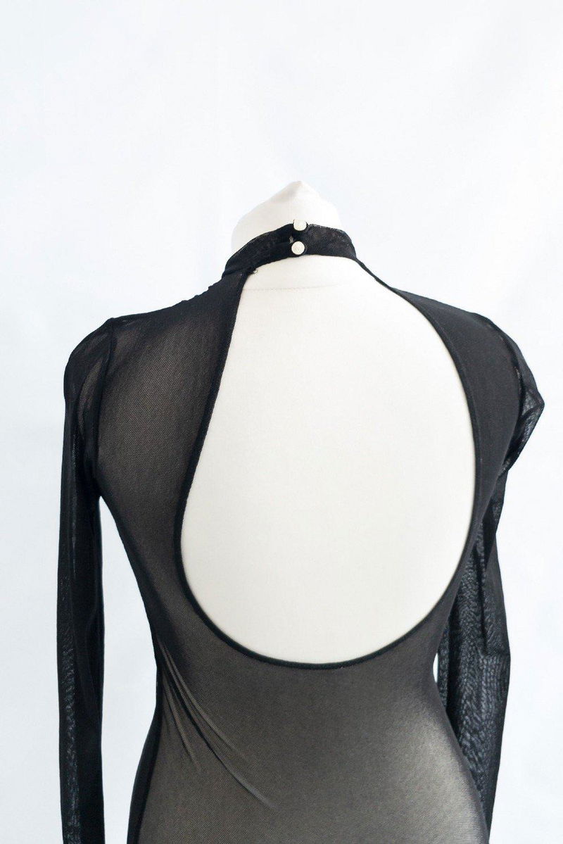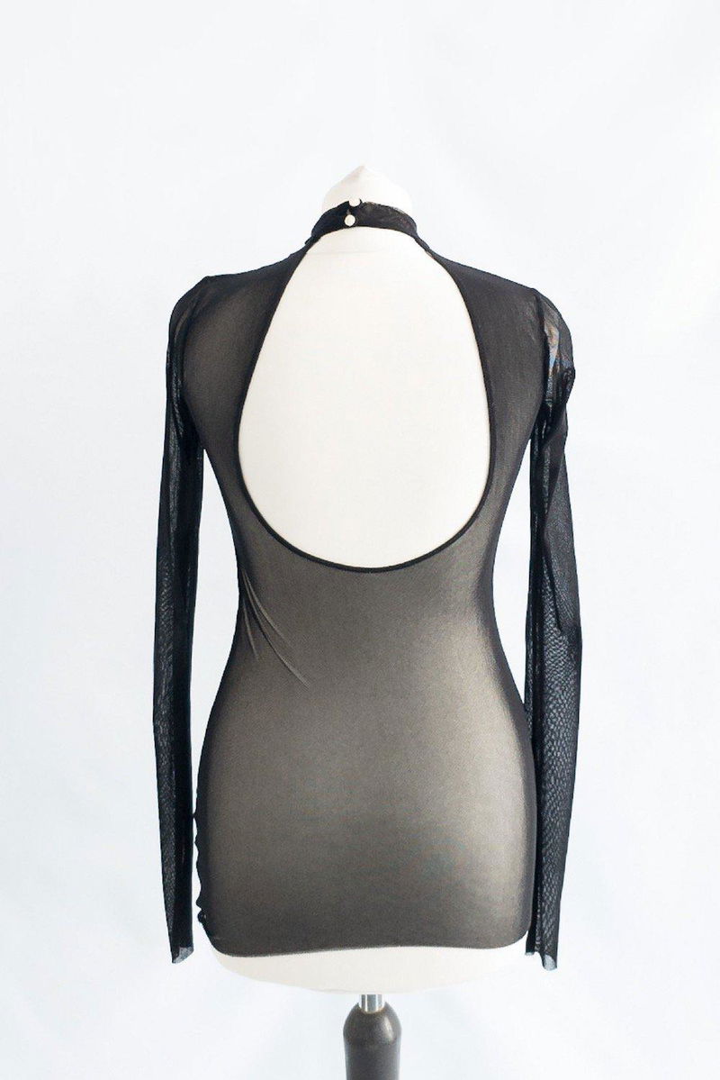 Black mesh long sleeved backless top with a mock neck and button fastening at back of neck. This fabric also has a slight stretch to it.