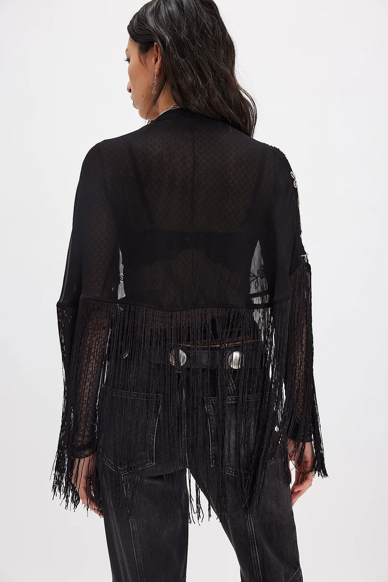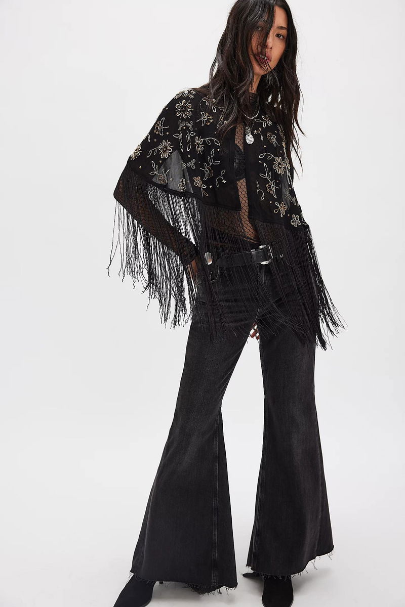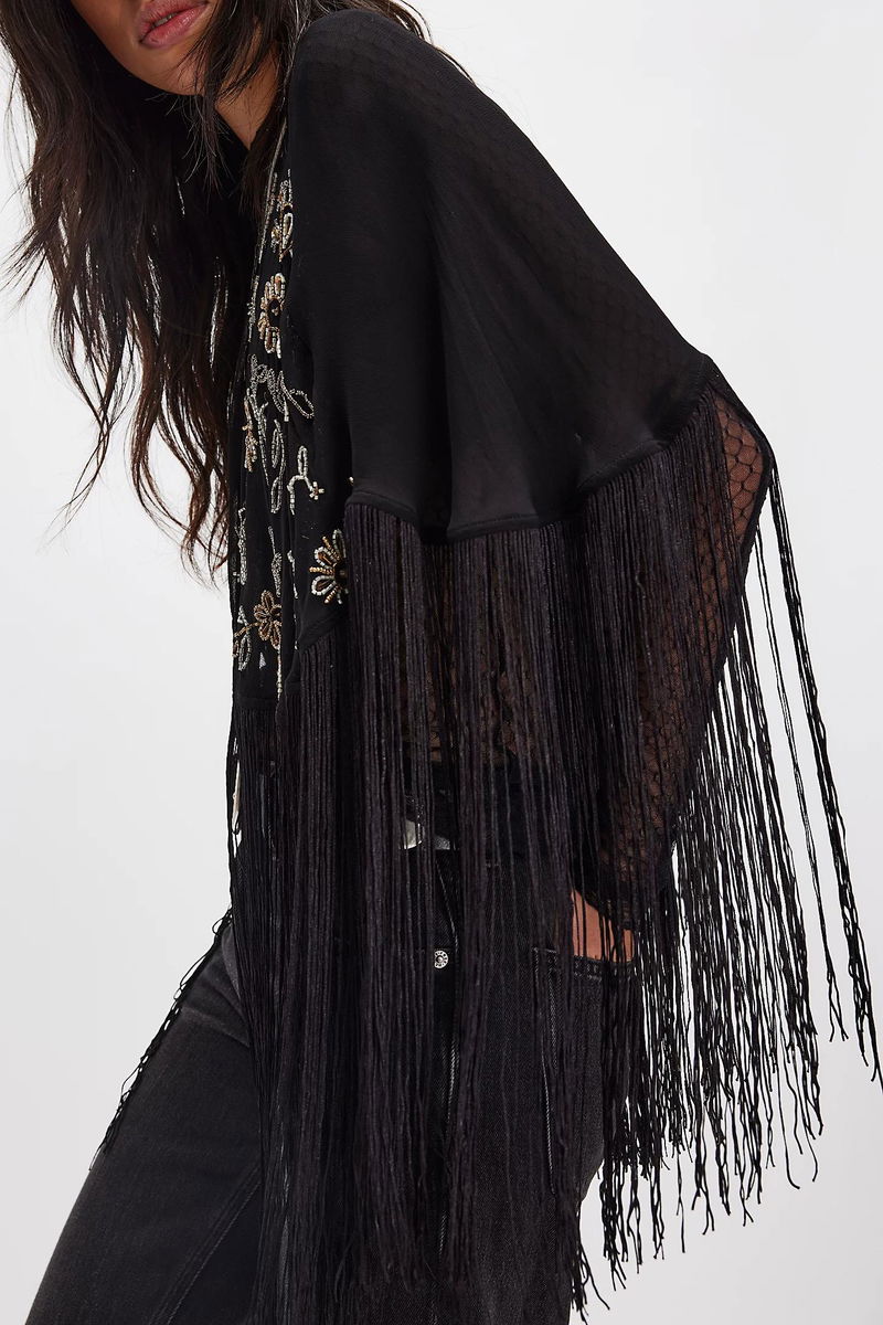 Add the coolest layer to every look with this super cute cape featured in a sheer, embroidered design with defined fringe trim at bottom for a head-turning touch.