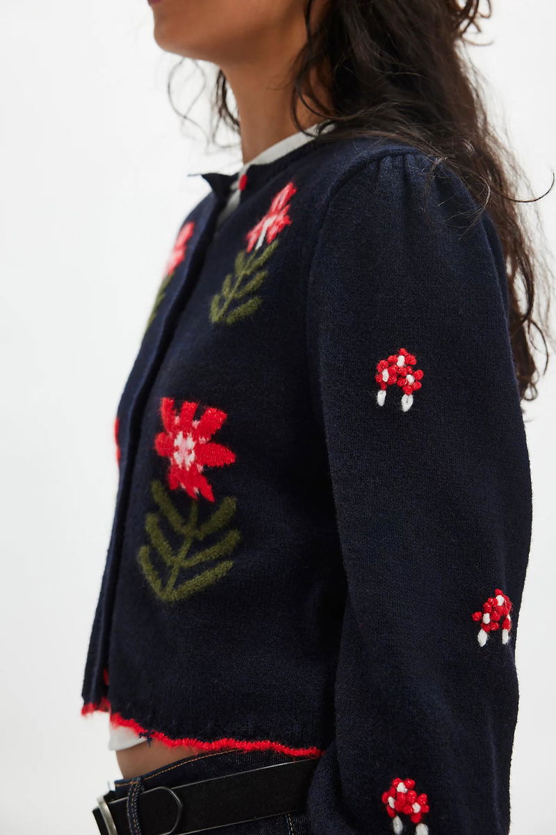 Your grandma’s favorite sweater, this charming cardi features super soft knit fabrication, a cropped, relaxed-fit silhouette, and sweet embroidered details, making it a whimsical addition to any wardrobe.