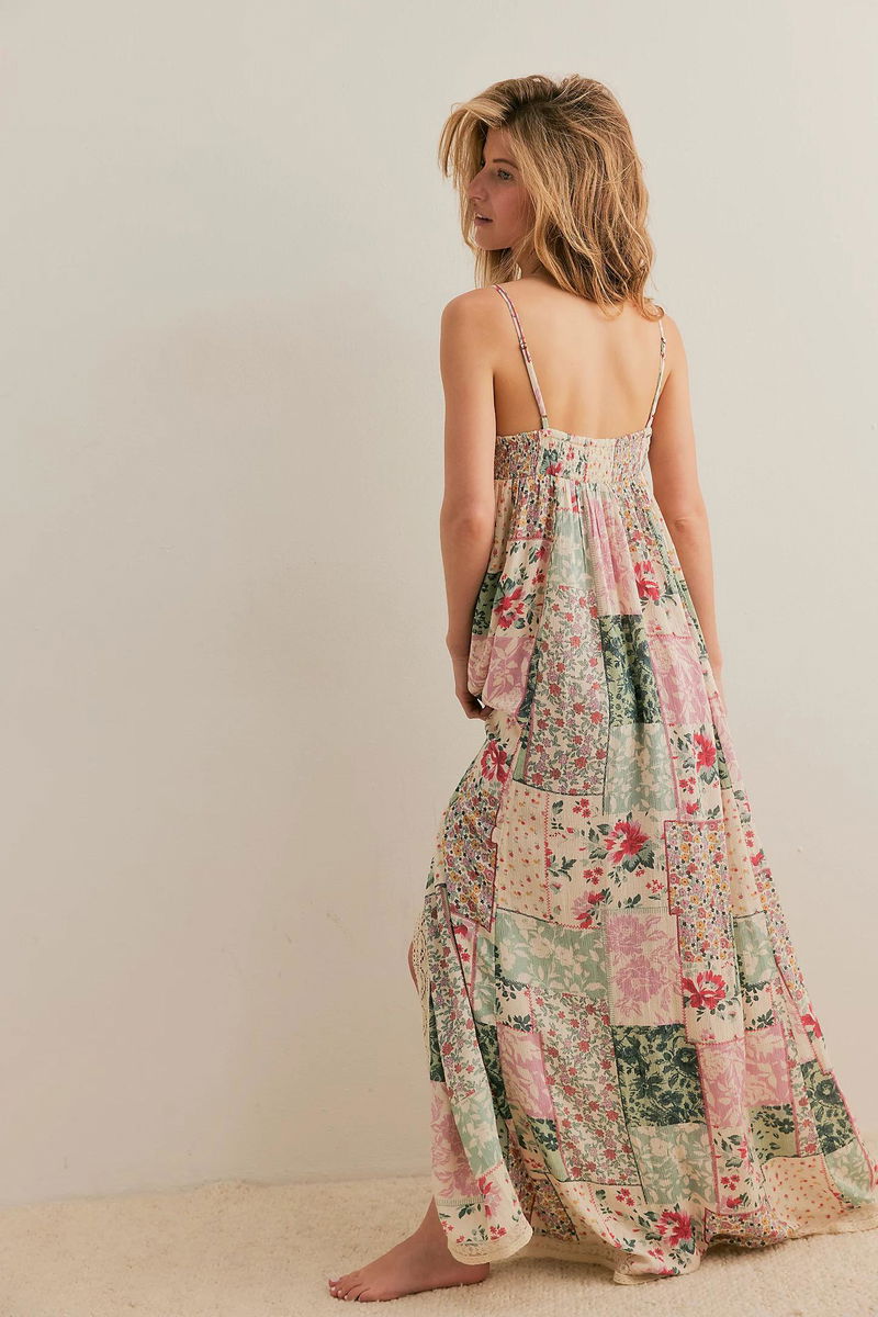 Forever femme, this flowy maxi dress features a floral patchwork design adorned with lace and finished with a slit for a sultry touch.