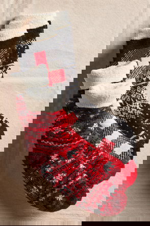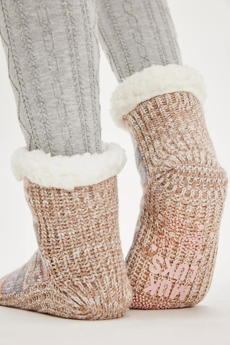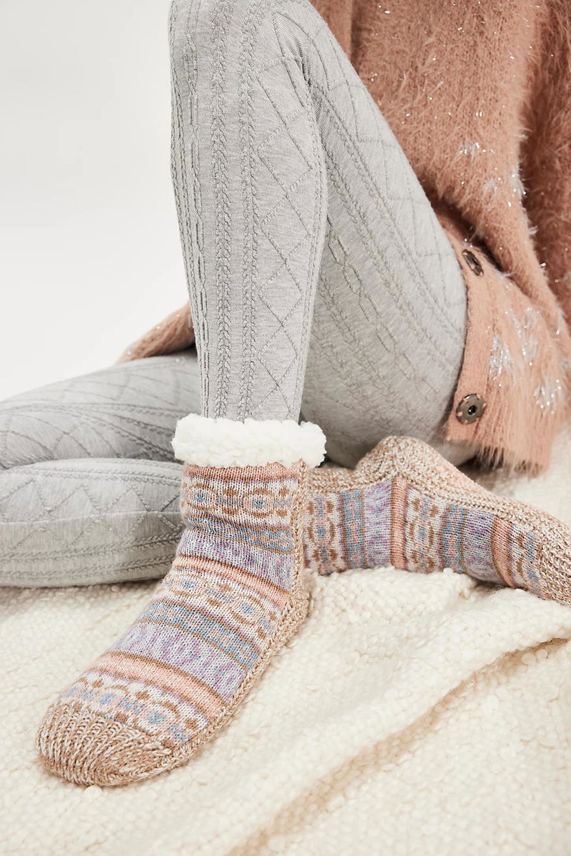 The perfect pair to add a cute and cozy touch to your cold-weather accessories collection, these staple socks are featured in a slipper-inspired style with a printed knit fabrication and faux fur interior lining for a forever timeless finish.