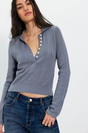 Cozy meets prep with this cropped cable knit polo, complete with a dainty embroidered flower and decorative button details.
