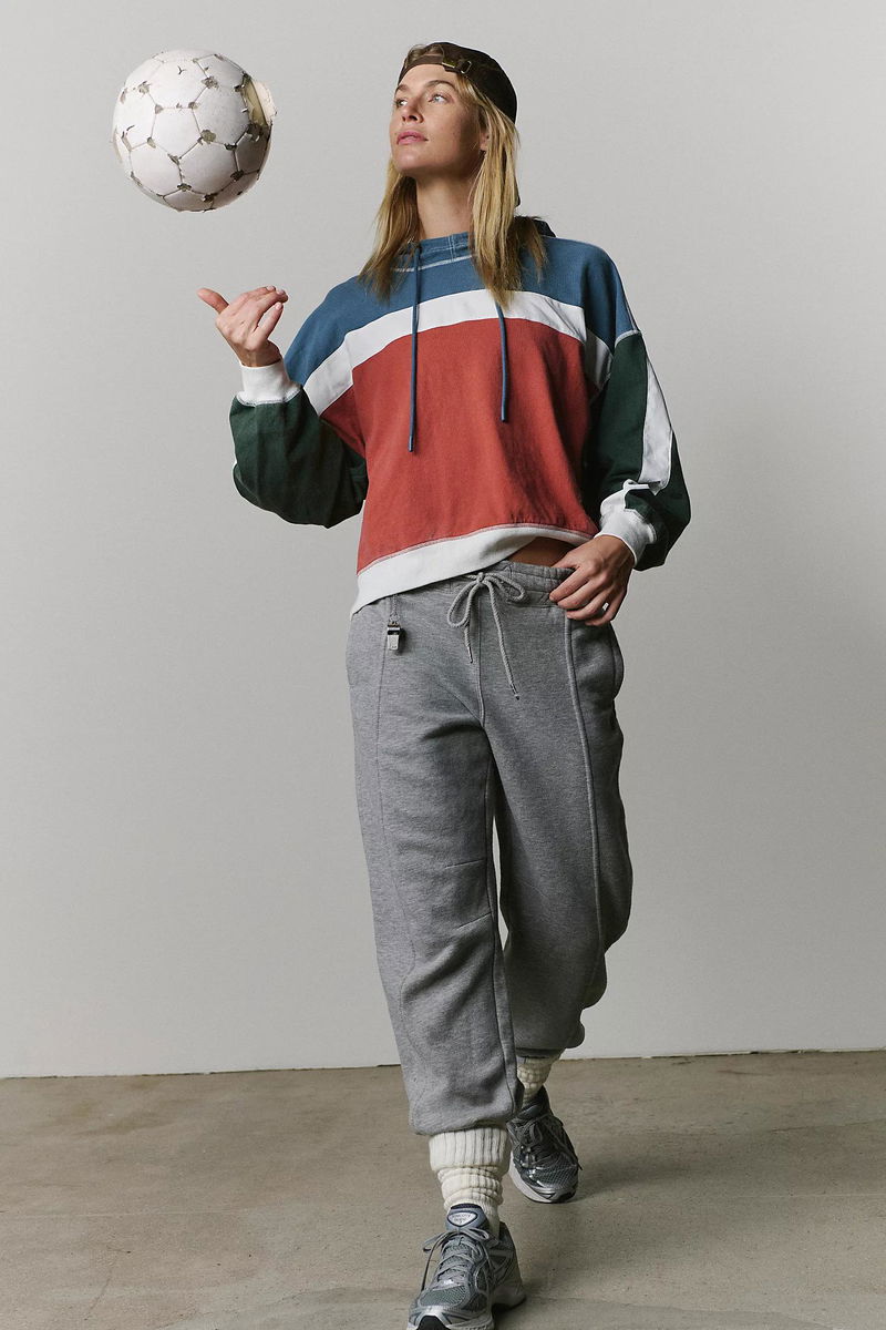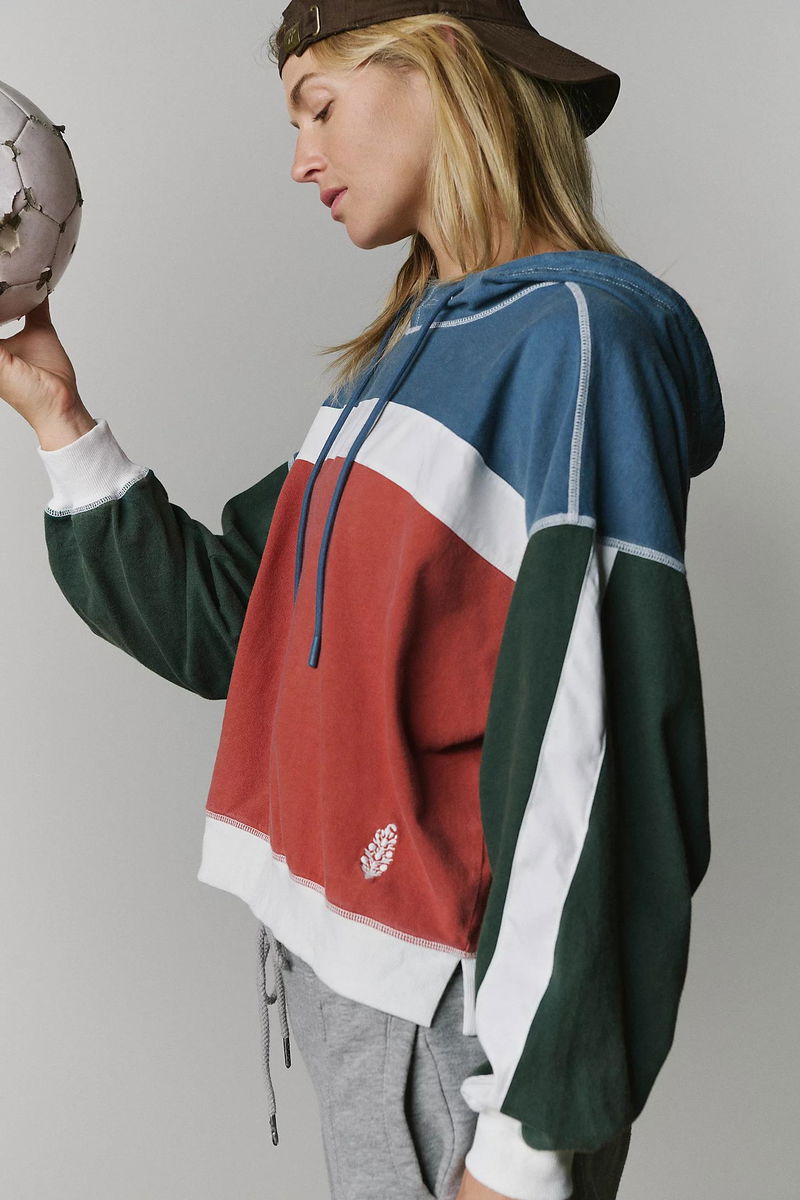 Light hooded layer with a colorblock look, topped with adjustable drawstring hood and a rib-knit trim.