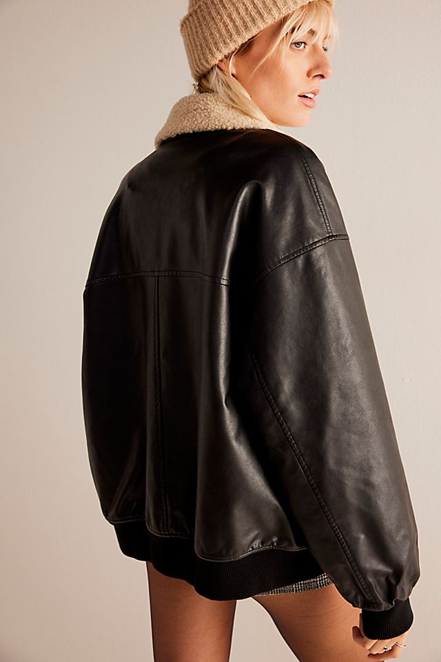 Bring the extra-cool, vintage vibes with this pilot-inspired vegan leather jacket, featured in a classic bomber style with a contrast fur collar for added texture. *Bomber style, vegan leather fabrication, elastic waist, long relaxed sleeves with ribbed cuffs, faux fur collar, front pockets, zipper closure.