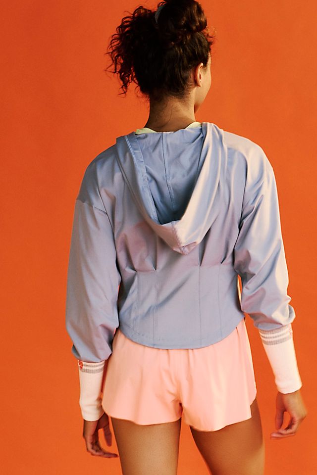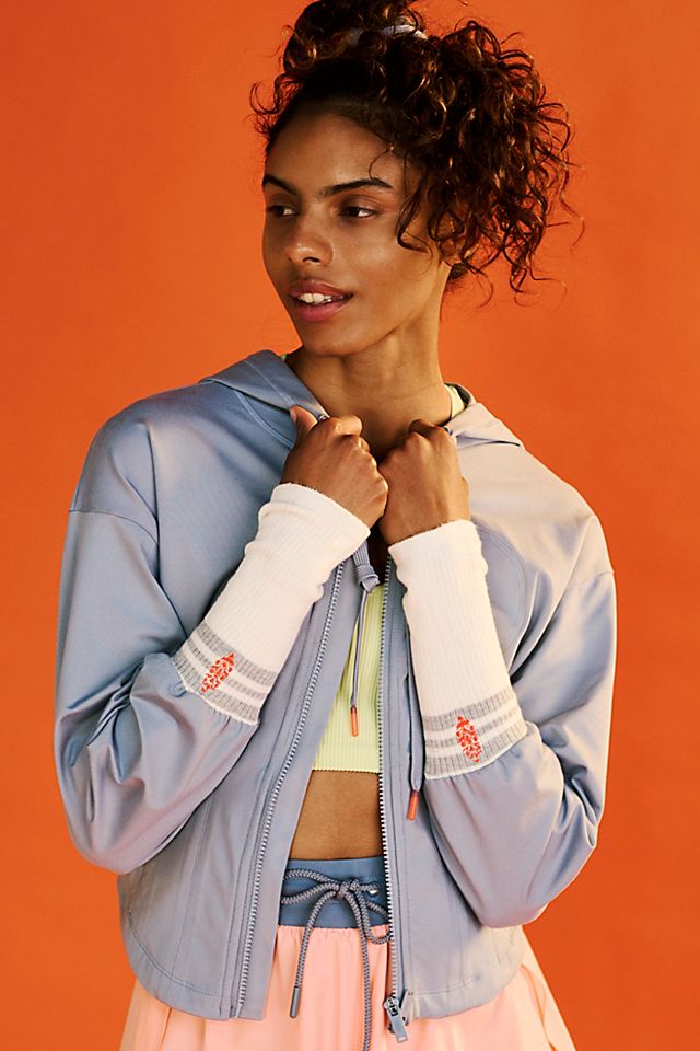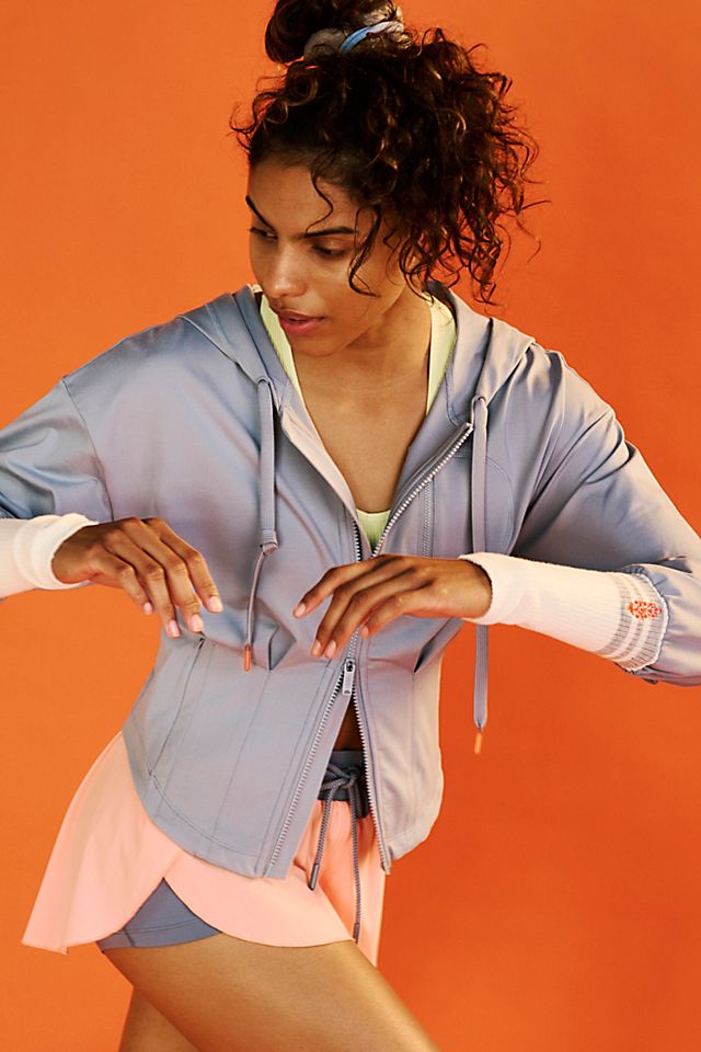 The perfect layer for your warm up or cool down, with a four-way stretch, sweat-wicking fabrication that keeps you comfortable while you work up a sweat, and flattering corset-inspired detail through the body, ribbed knit arm detail and adjustable hoodie.
