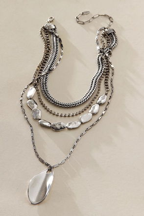 Take every look to the next level with this fun and funky style featured in a super layered design with mixed chains, beading, and stunning pendant at center for the ideal finishing touch. 5 strands, adjustable length, lobster clasp closure, layered design, mixed chains and textiles. This wear-anywhere necklace is the most effortless way to transition you from your daytime thing to a date night out.