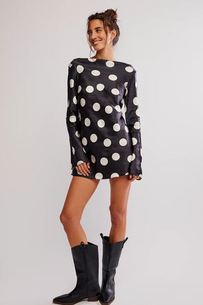 Your favorite silhouette, now in a playful print. Totally cool and so stunning, this mini dress features a swingy A-line silhouette, a plunging V-neckline, and sheer sleeves for a sultry touch.