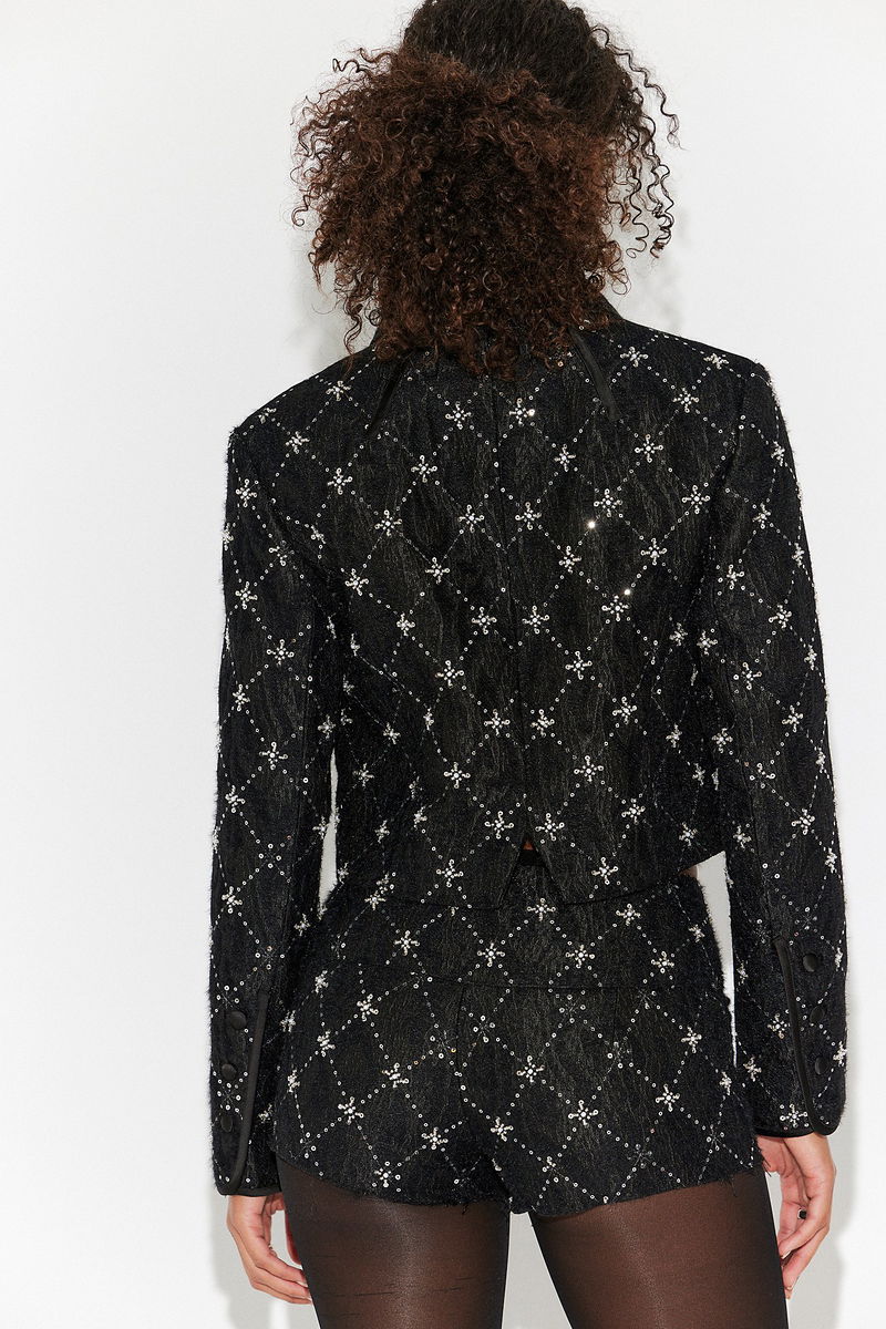Add a little sparkle to your ensemble with this stunning jacket, featuring a whimsical quilted fabrication, a cropped, boxy silhouette, and diamond-style sequin embellishment for an elevated twist.