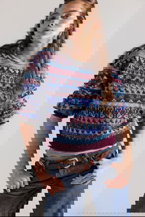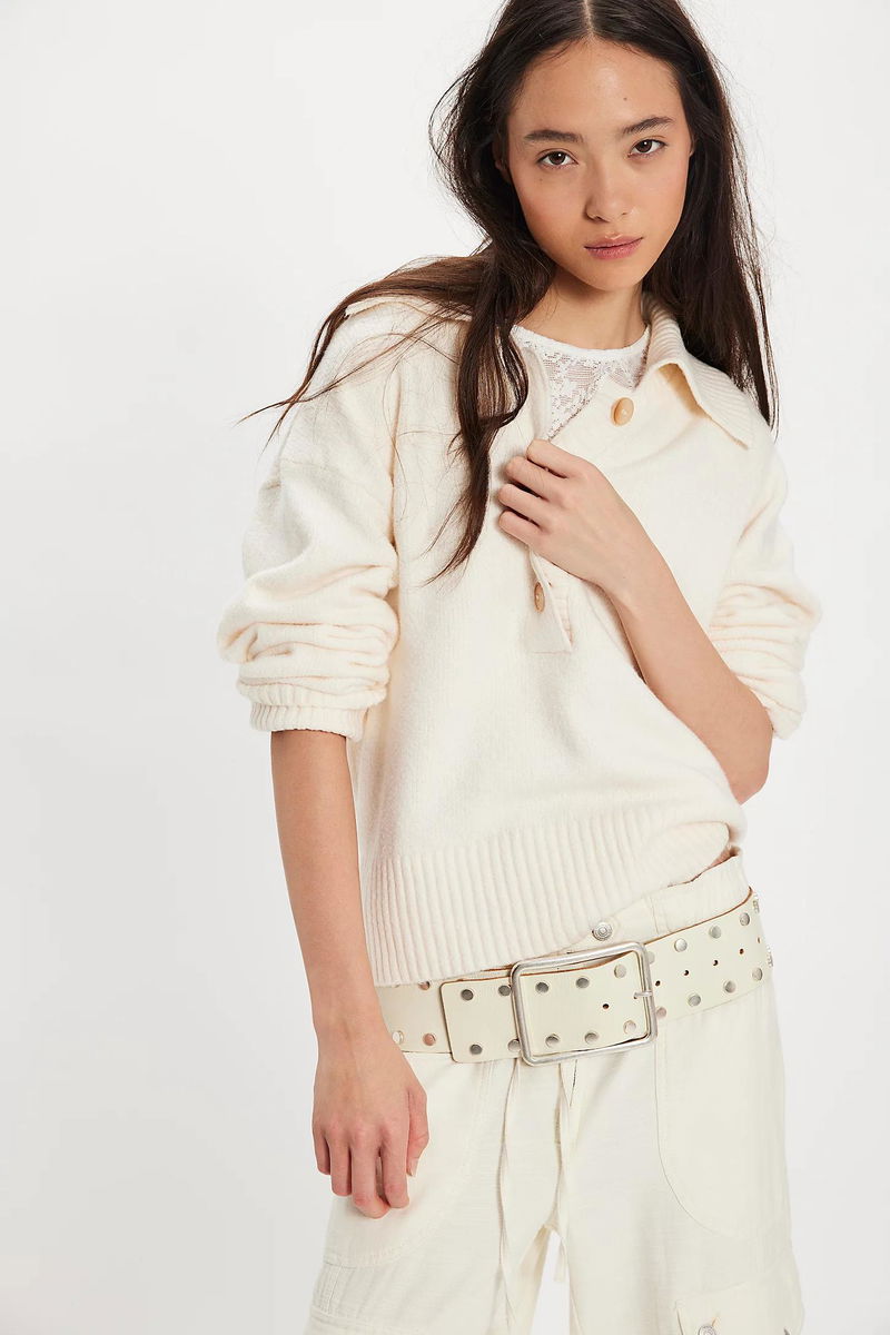 The definition of cozy, this sweater features a classic polo-inspired silhouette, a cotton-blend knit fabrication, and charming tortoise shell buttons.