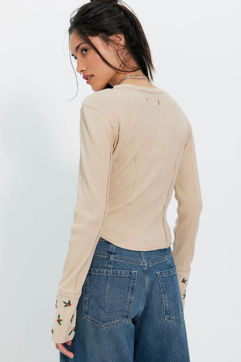 A signature FP style, this fitted, cardi-style top from We The Free is featured in a classic ribbed fabric with embroidered cuffs for that iconic touch.