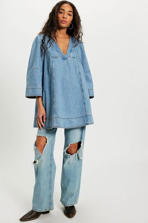 Made for everyday wear, this effortless denim mini dress from We The Free features dramatic bell sleeves, a classic button-front style, and ruffled accents–perfect for an instant outfit.