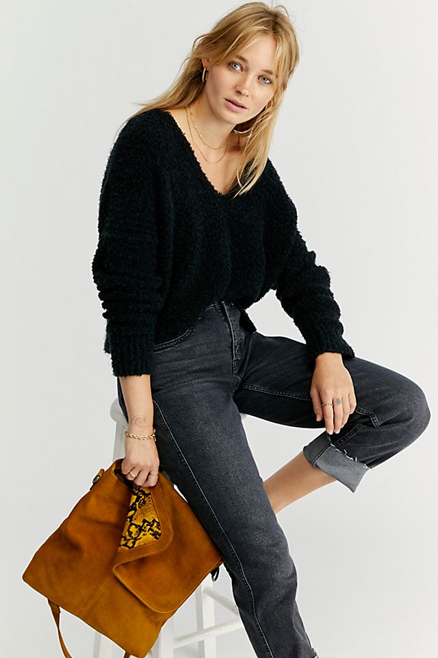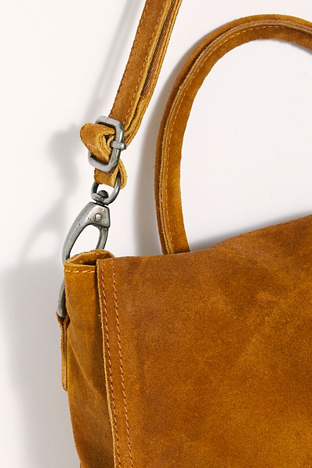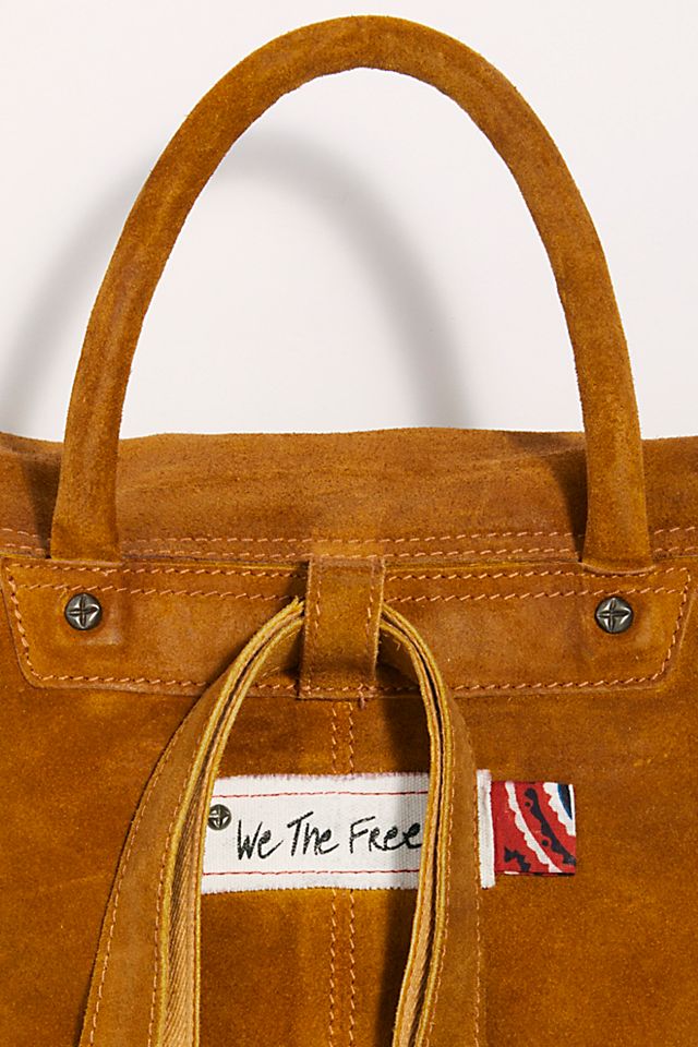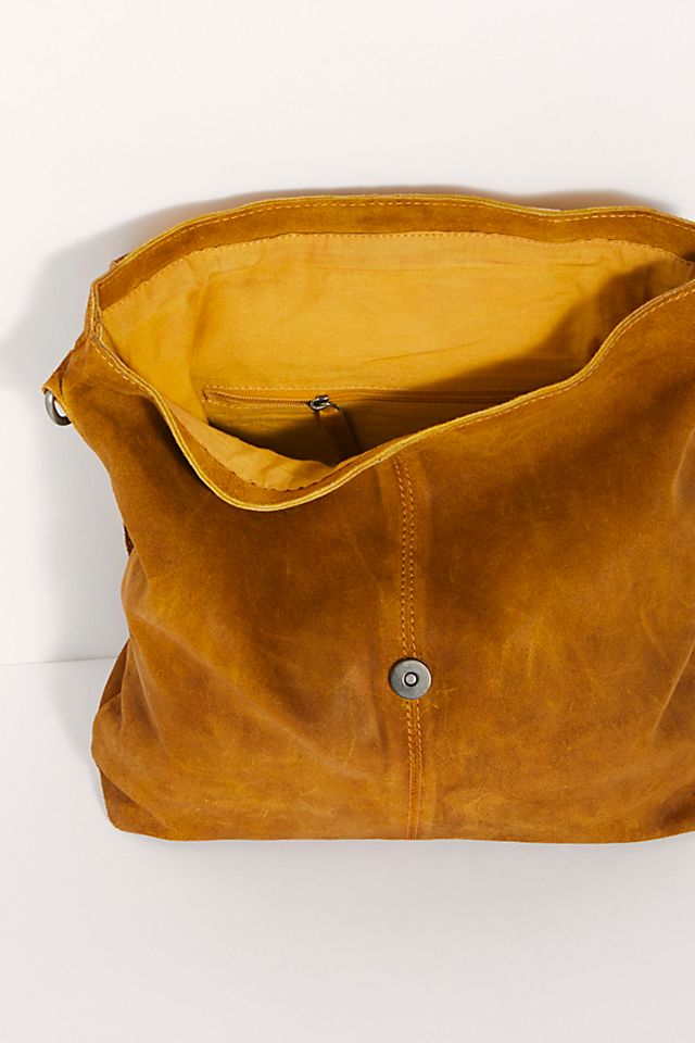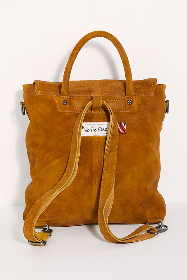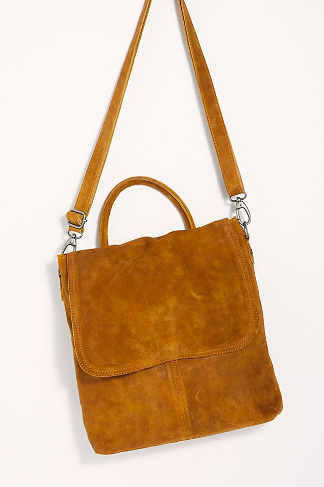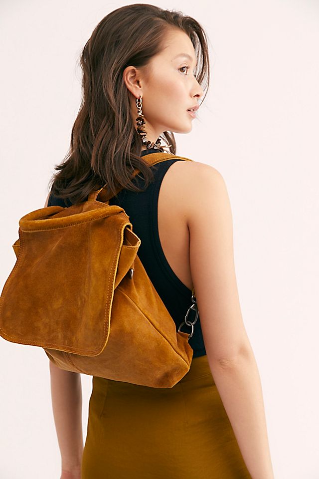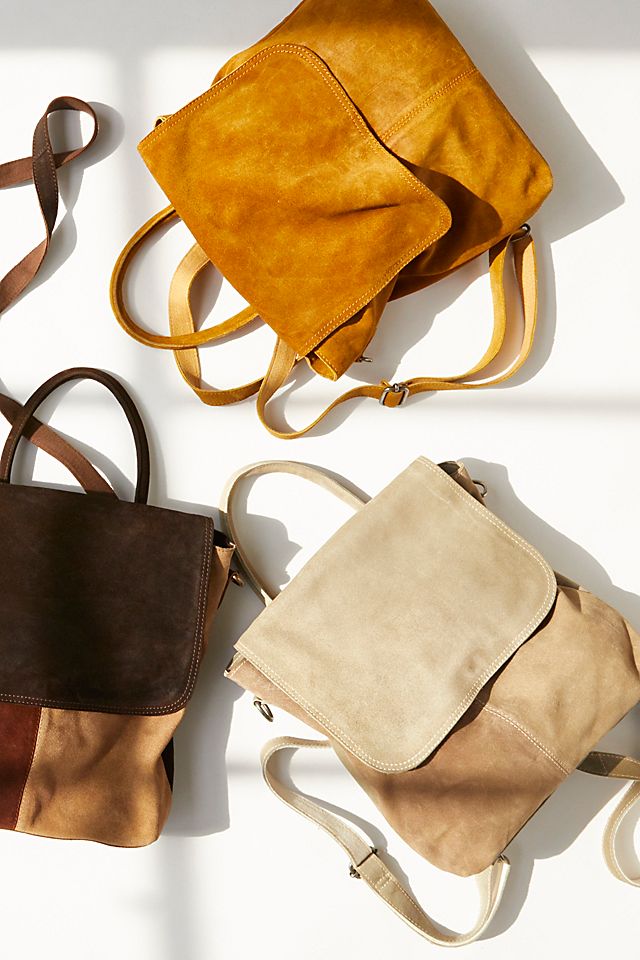 Slouchy suede backpack featured in a messenger style with a flap top closure and convertible straps so it can be worn as a crossbody.