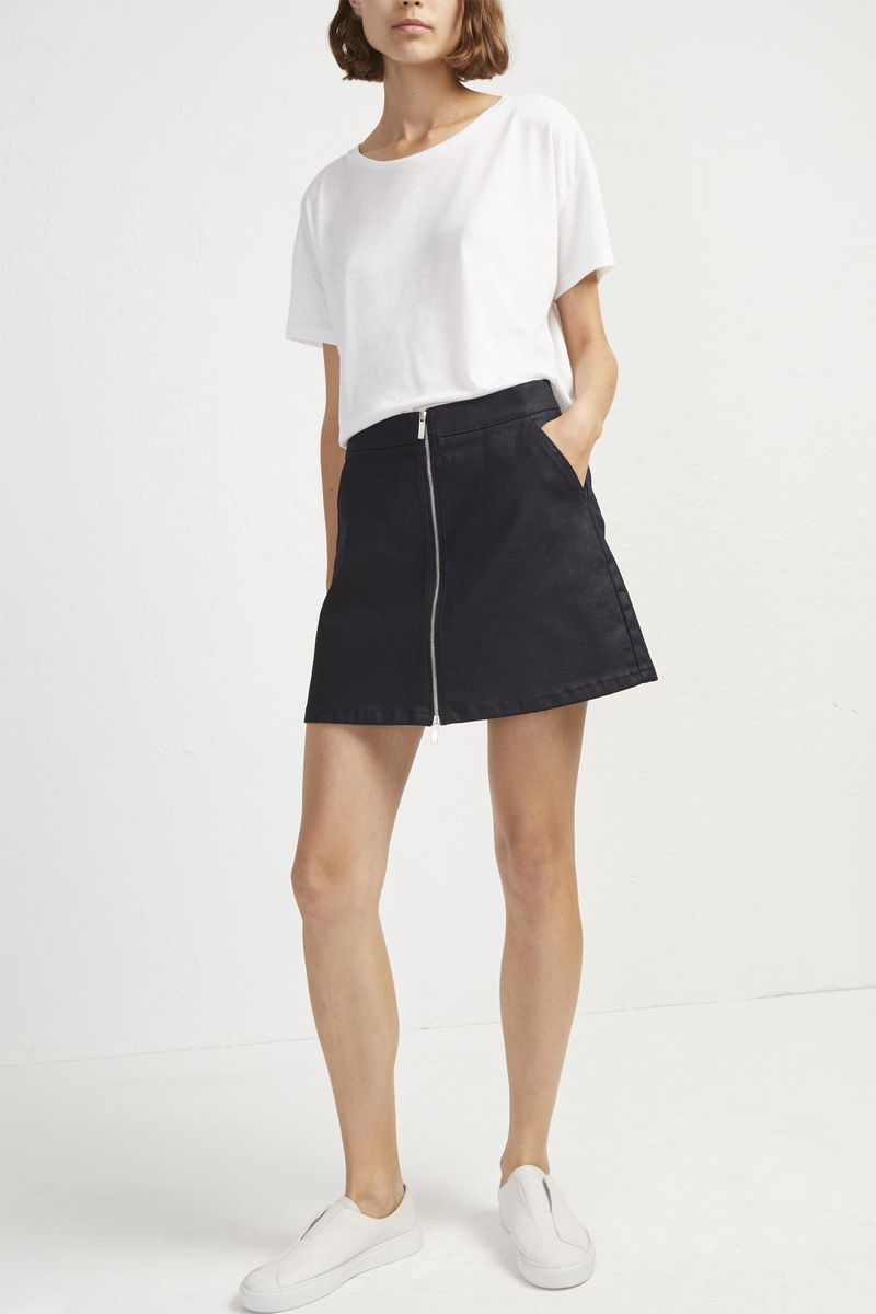 Solve endless style dilemmas with the Raisa Shine Denim A-Line Mini Skirt. The flattering a-line skirt has a casual look, with a large zip-front fastening adding interest to the understated denim piece. Pair with a cotton t-shirt and trainers for easy weekend style.