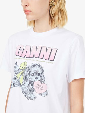 GANNI printed tee crafted from 100% certified organic cotton jersey, featuring GANNI logo and four leaf clover motif and "Have A Lucky Day" and "Please Recycle" message on front.