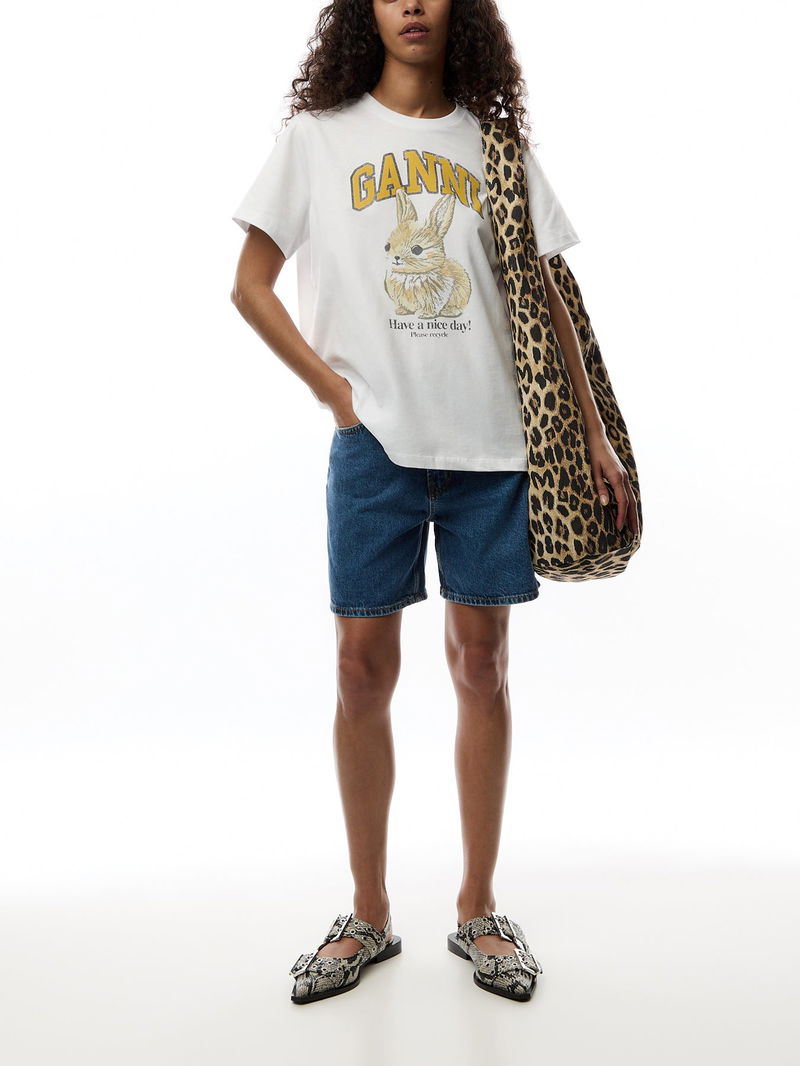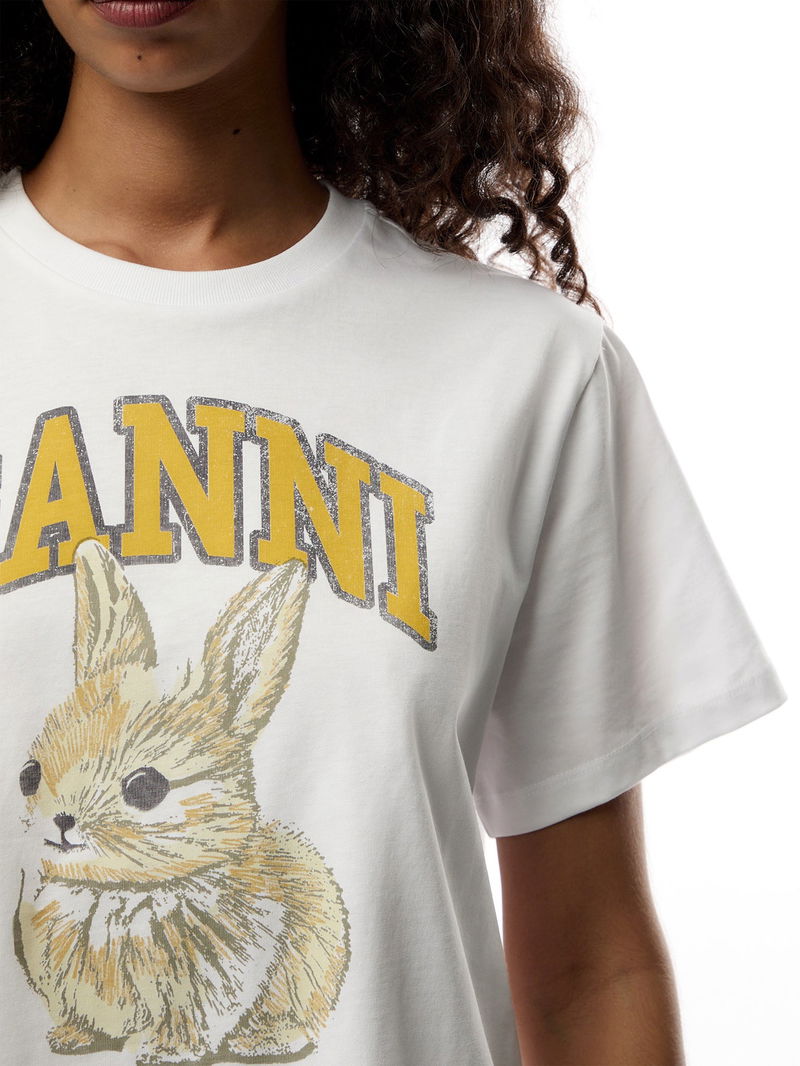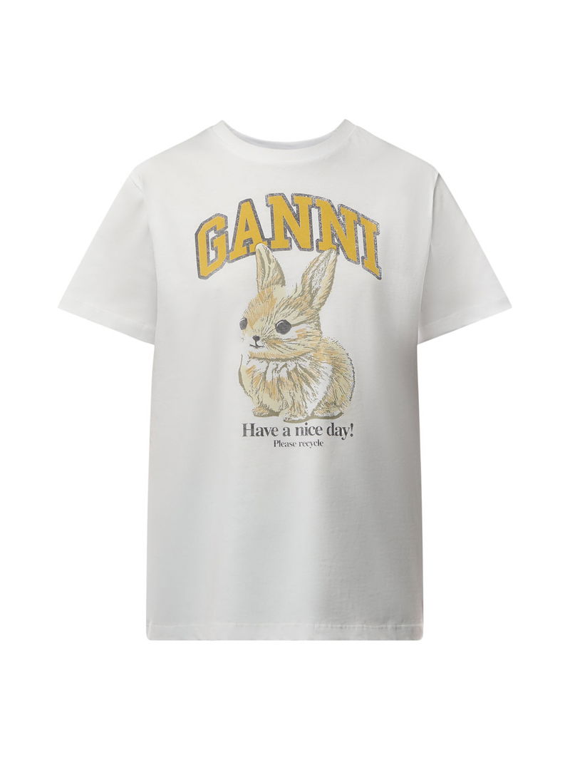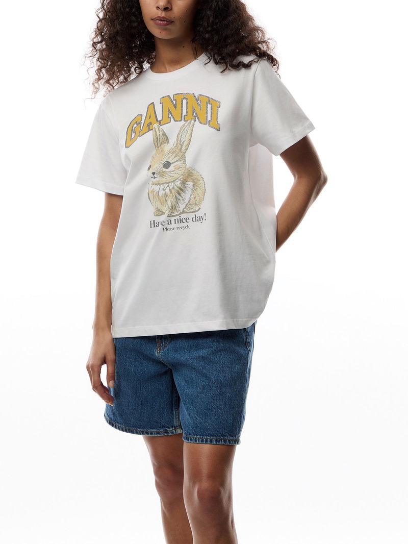 This Basic Jersey Bunny Relaxed T-Shirt by Ganni is made from organic cotton for a comfortable and sustainable fit. The relaxed fit and bunny graphic add a playful touch to any outfit.