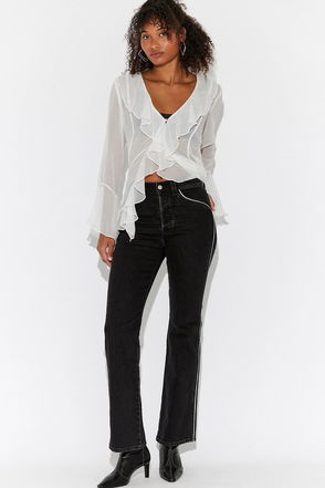 Bootcut jeans, Denim, Belt loops, High-rise cut, Five pockets, Button and concealed zip fastening at back.