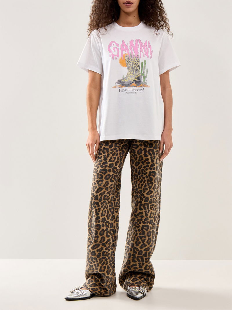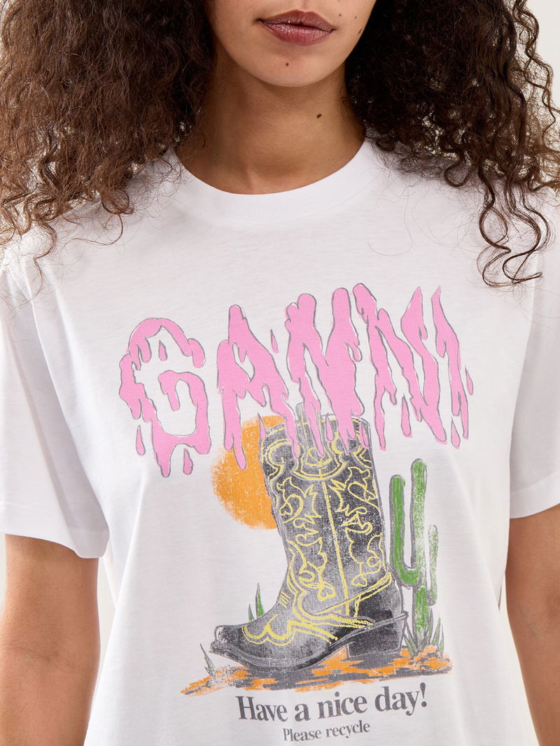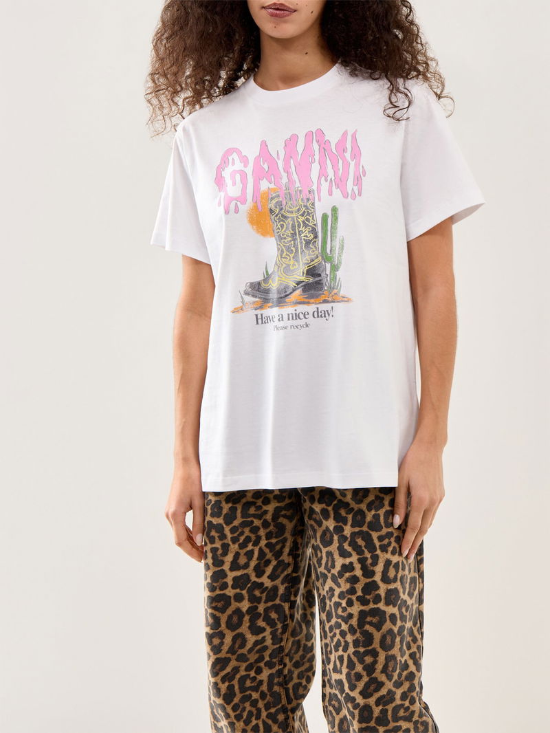 The Boots Print Short-Sleeve Jersey T-Shirt White by Ganni features a playful graphic set against soft cotton jersey. Its relaxed fit makes it ideal for casual layering. A characterful piece for everyday dressing.