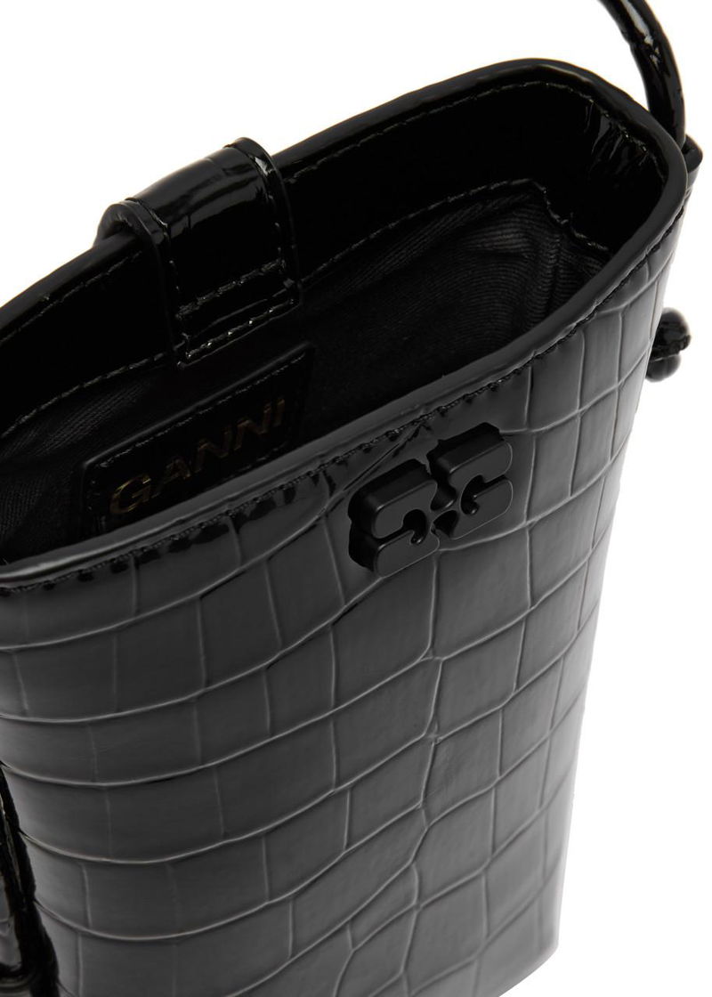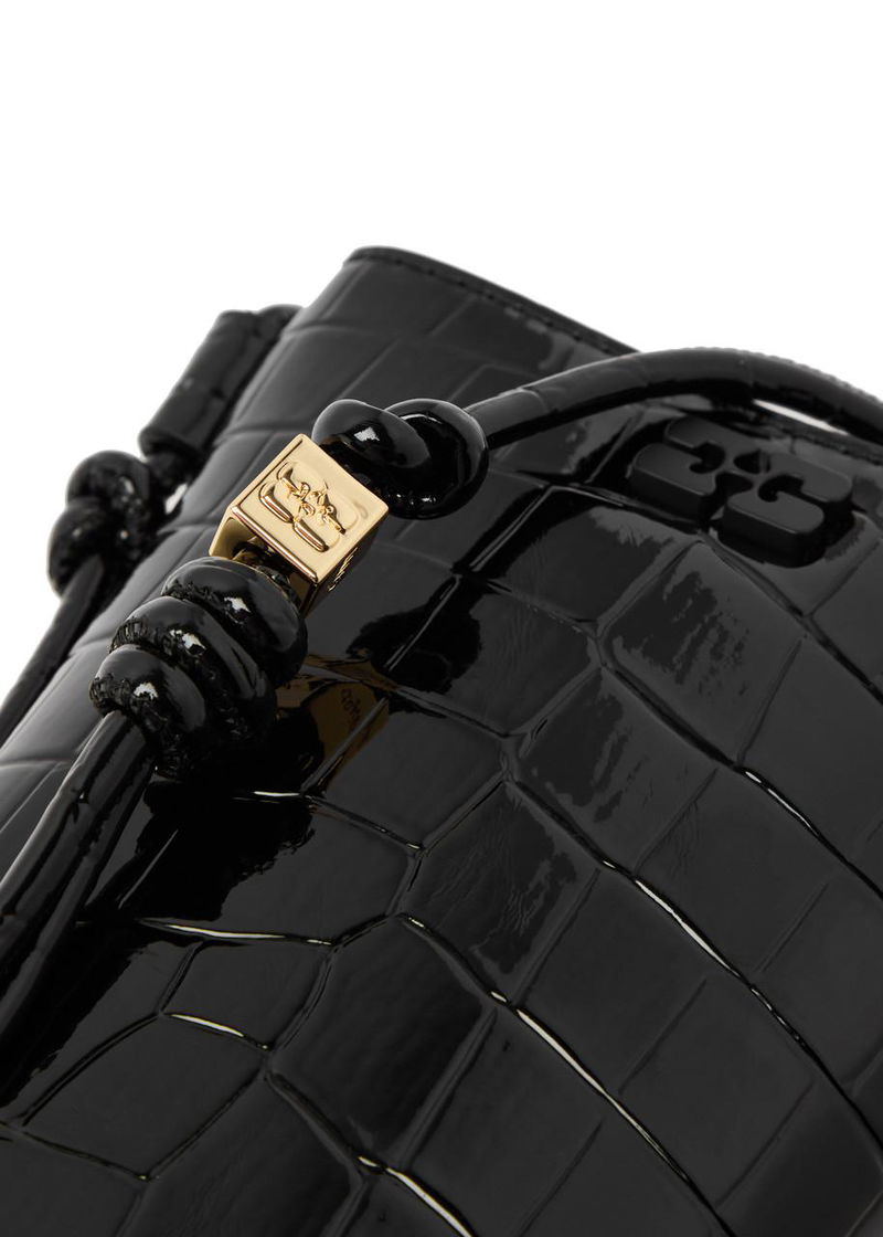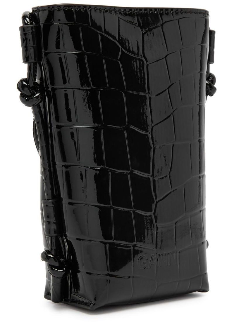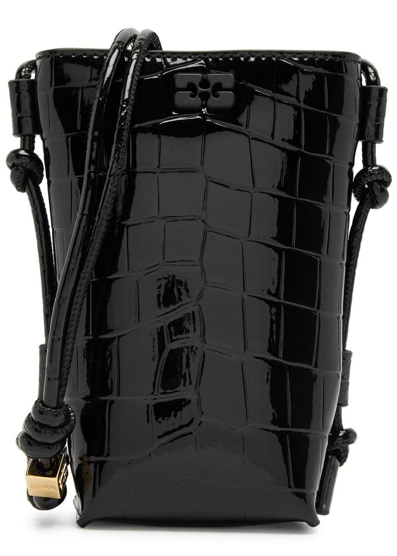 Ganni glossed leather cross-body bag. Crocodile effect, adjustable shoulder strap with knotted details, logo-engraved cube embellishment, butterfly designer plaque, debossed logo at back, fully lined. Concealed magnetic press-stud fastening at top.