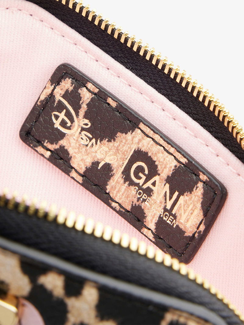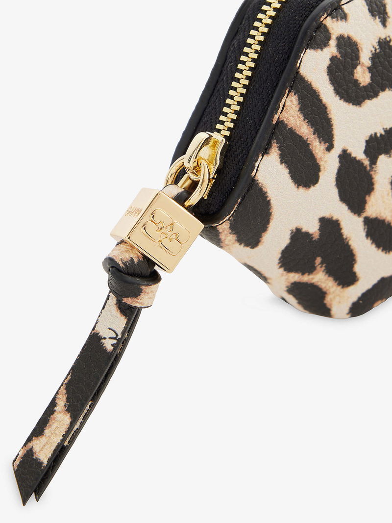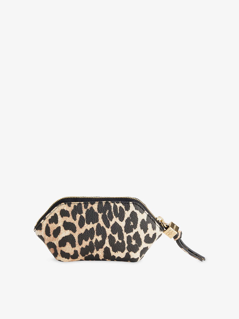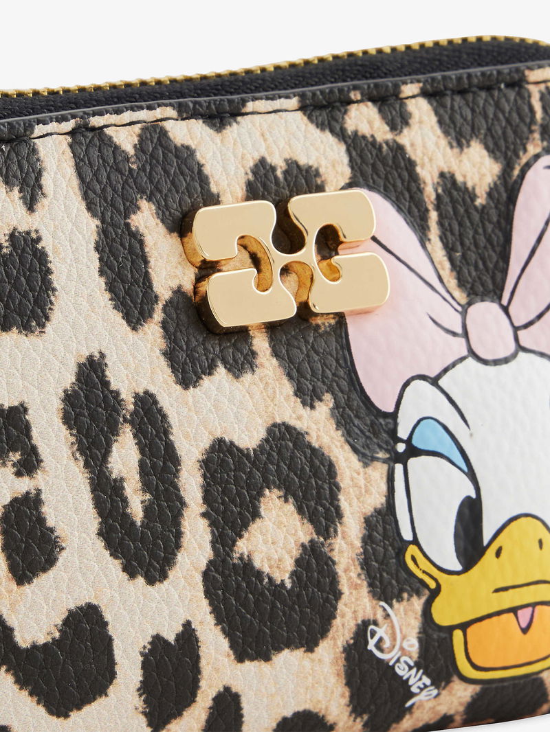 Ganni faux-leather coin purse. Soft shape, logo hardware at front, Daisy print at front, all-over leopard print, one main compartment, interior logo patch.