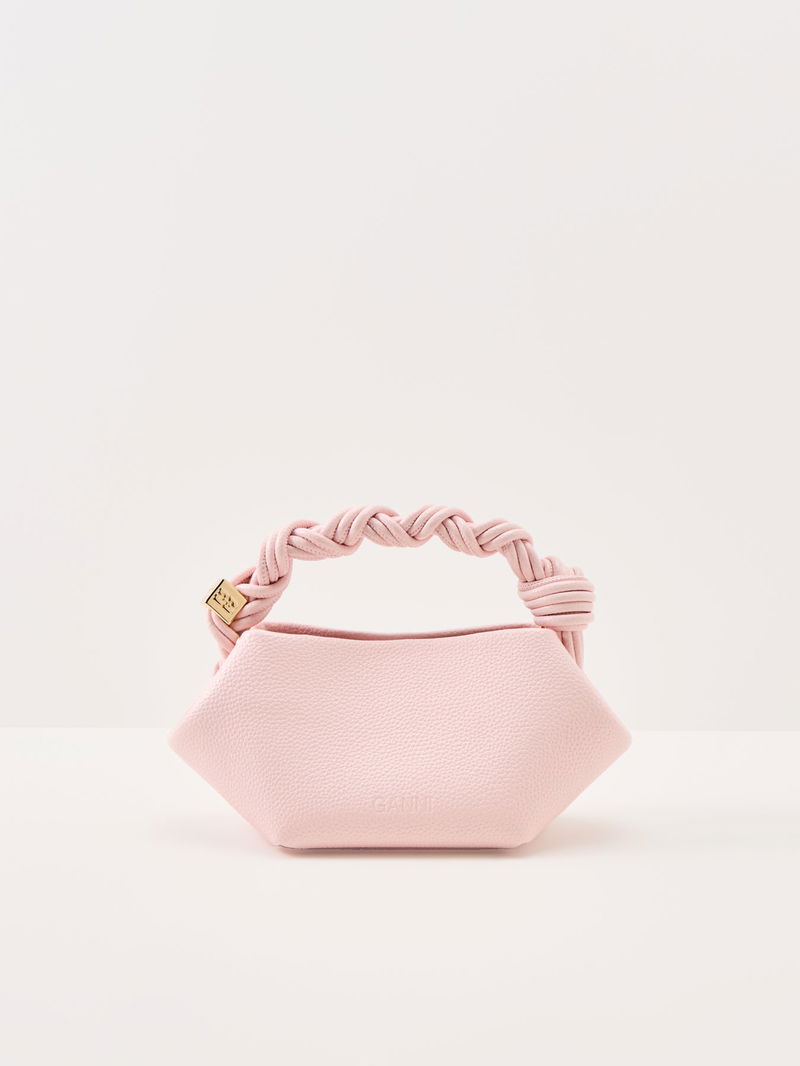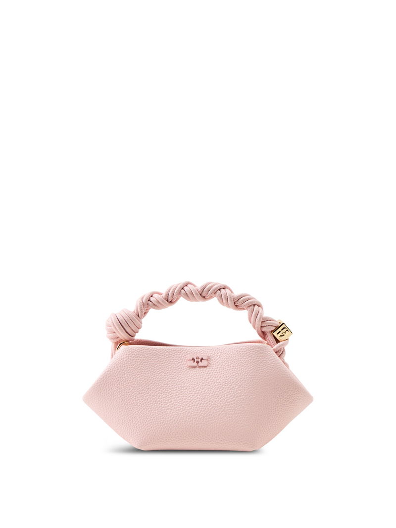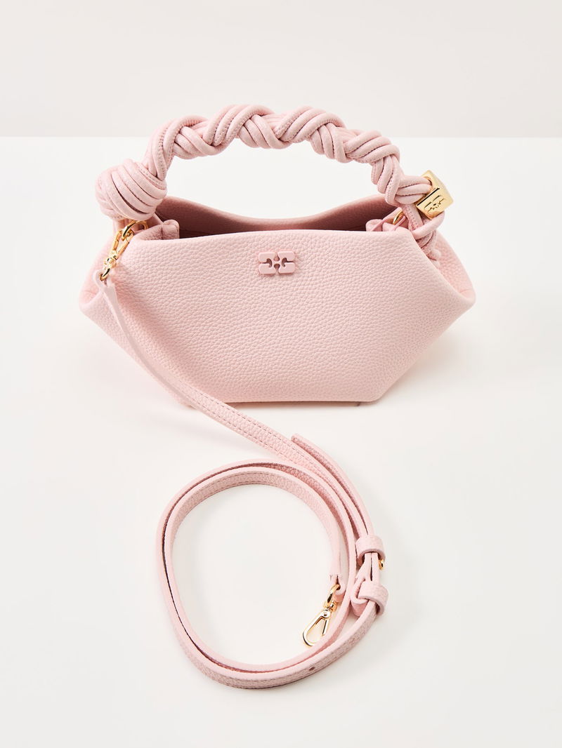 Product Details The Bou Mini Grained Leather Crossbody Bag Pink by Ganni adds playful colour to a compact, everyday silhouette. Featuring grained leather and a curved shape, it balances modern character with practical storage. Carry it crossbody to introduce a refined touch of colour to your curated wardrobe.