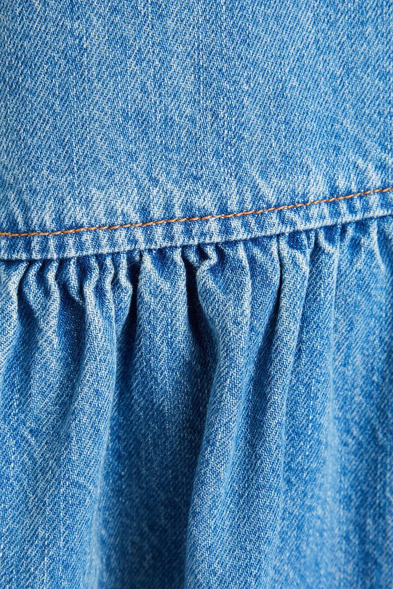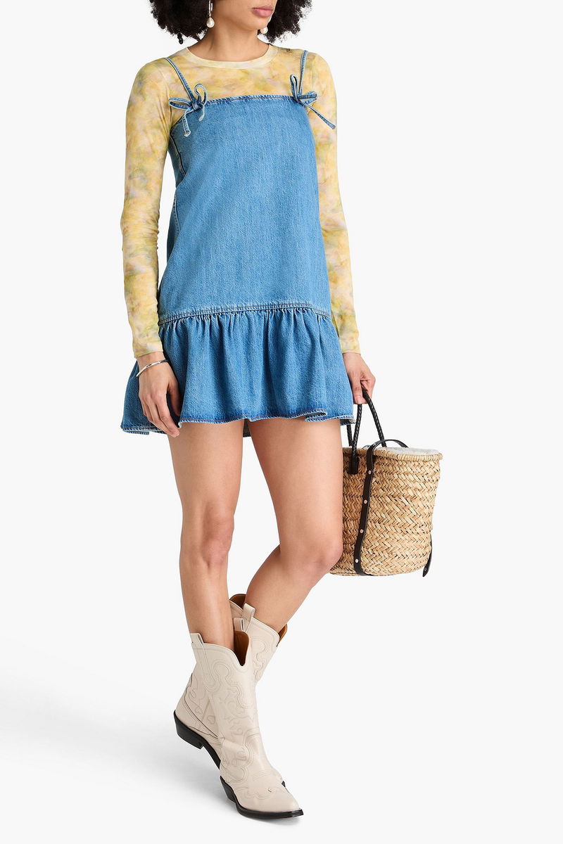 Dress, Denim, Adjustable straps, Bow-detailed, Ruffled hem, Slips on, Mid-weight, non-stretchy fabric.