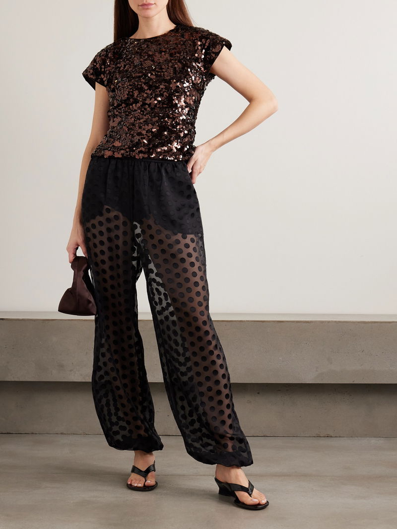 If you're looking to make a statement at cocktail hour, GANNI's top is the one. Based on a plush velvet backdrop, it's saturated in light-reflecting sequins that sparkle under any spotlight. It has an open-back detailed with a satin bow for extra elegance.
