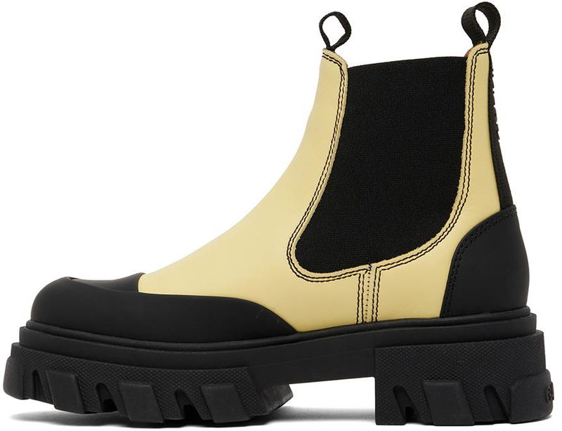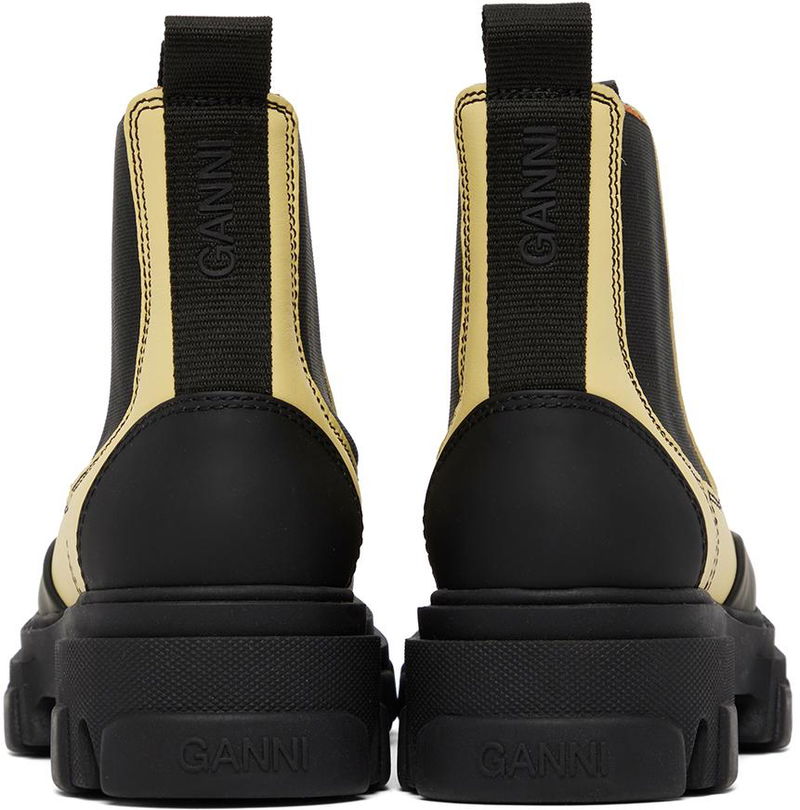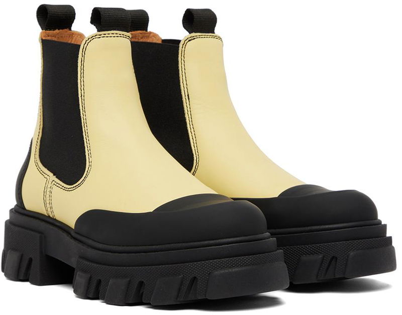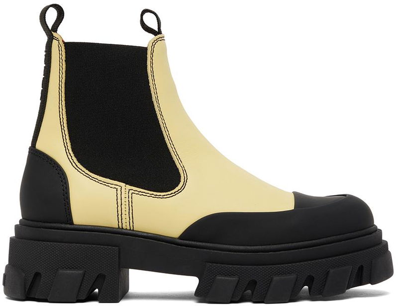 Ankle-high paneled buffed leather and recycled rubber boots in yellow.· Elasticized gusset at sides· Pull-loops at heel collar· Logo bonded at pull-loop· Logo embossed at heel· Buffed calfskin lining · Contrast stitching in black· Textured rubber midsole· Treaded rubber outsole.